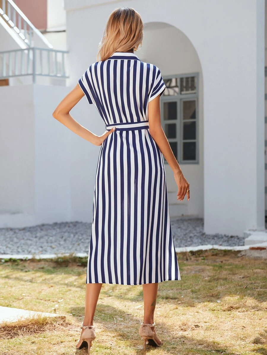 Striped Button Front Belted Split Hem Shirt Dress