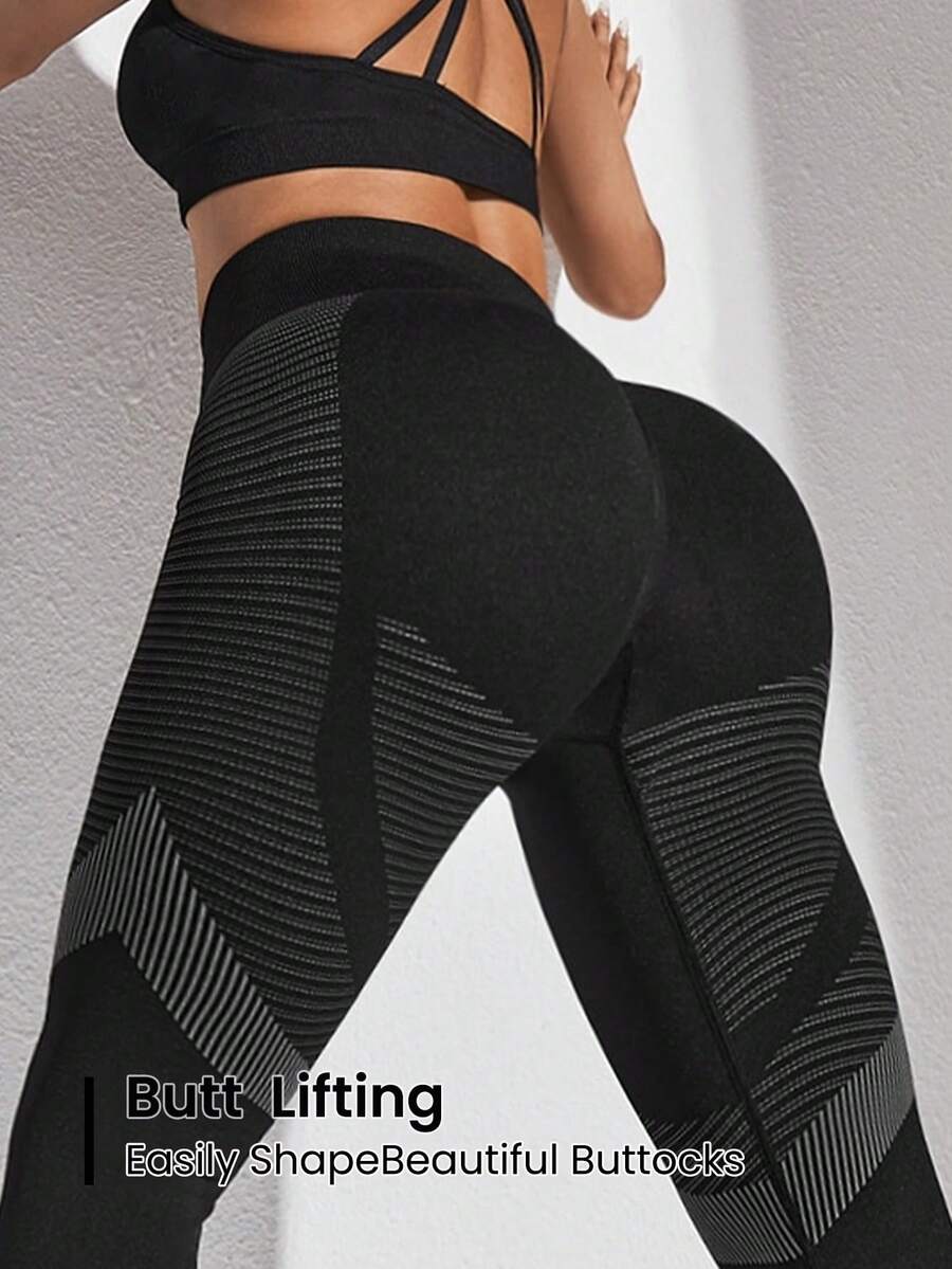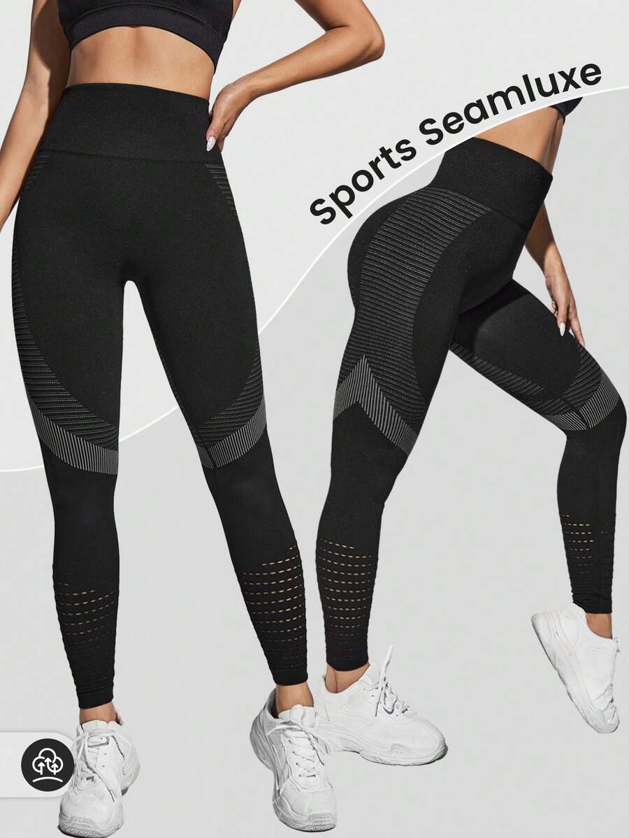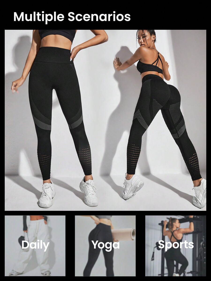 Striped Gym Leggings Seamless High Stretch Tummy Control Active Leggings With Hollow Out
