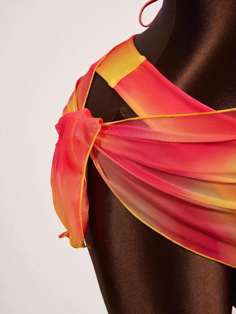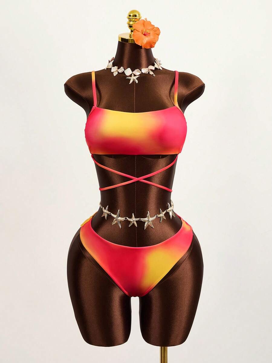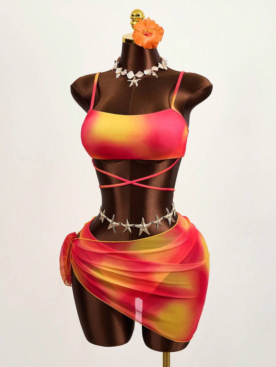 Summer Beach Ombre Bikini Set Criss Cross Cami Top & Hipster Bottom & Cover Up Skirt 2 Piece Bathing Suit