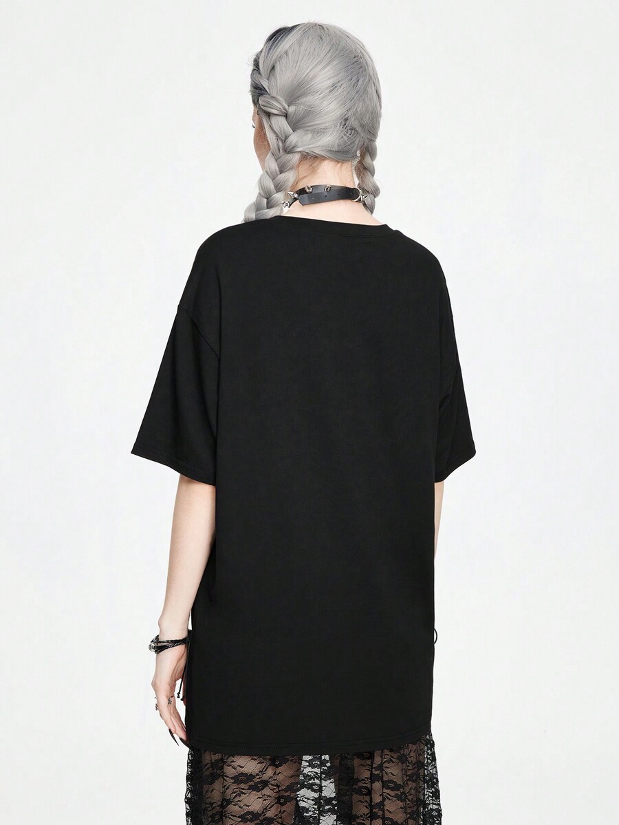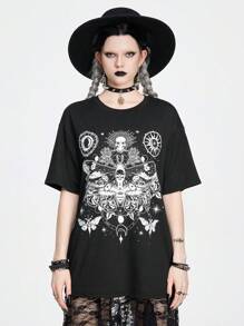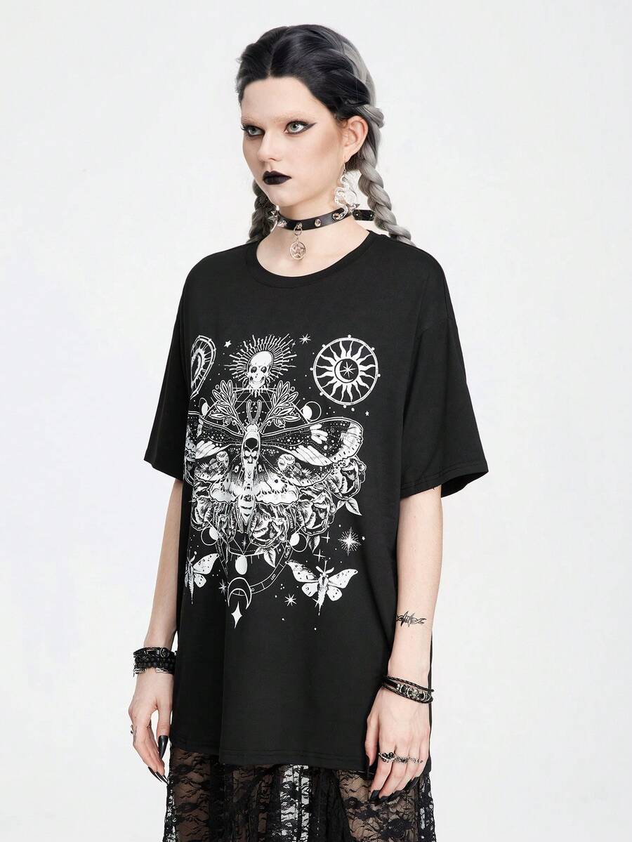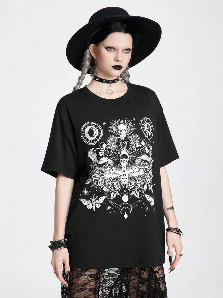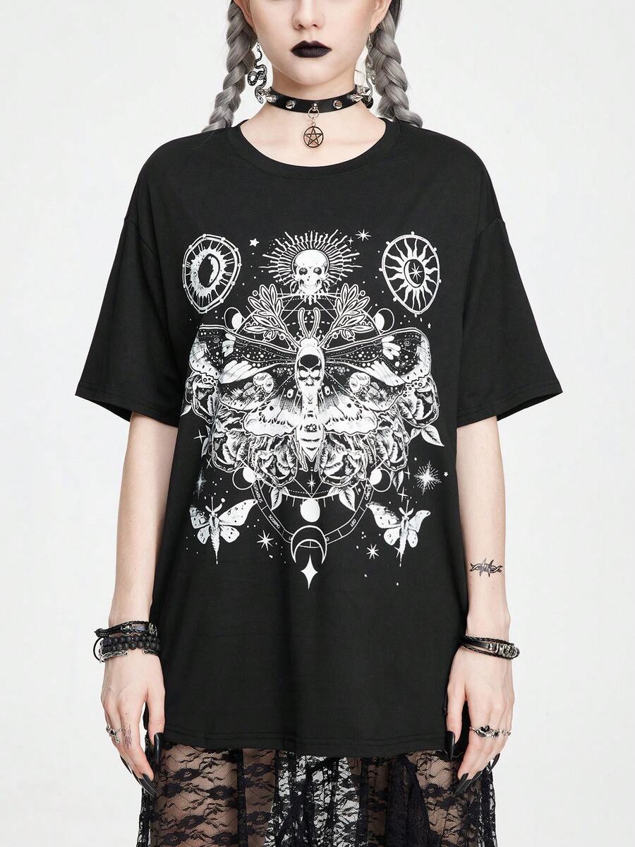 Summer Gothic Style Loose Short Sleeve T-Shirt With Moth Pattern For Women