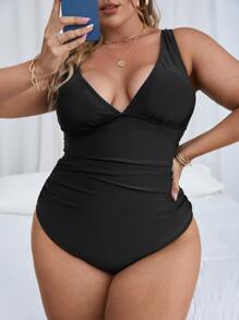 Summer Plus Size Plain Ruched One Piece Swimsuit