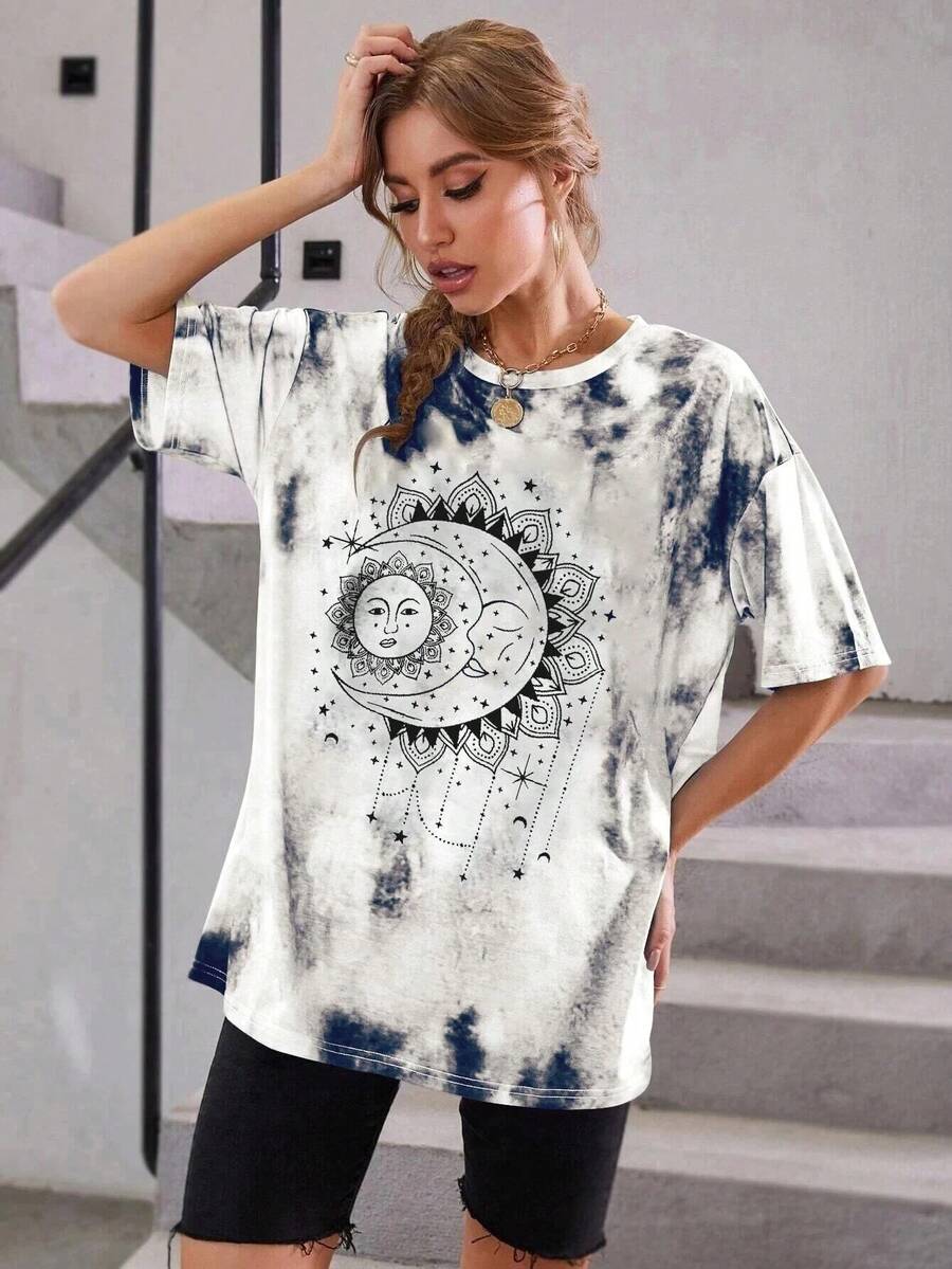 Sun And Moon Print Tie Dye Drop Shoulder Tee