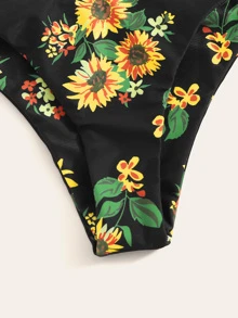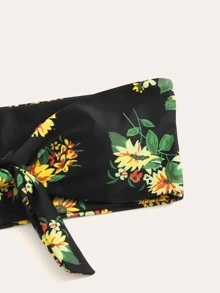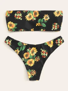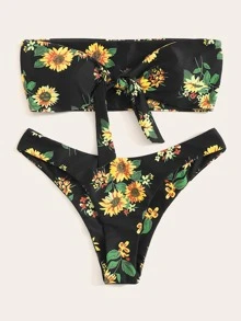 Sunflower Print Knot Bandeau Top With High Cut Bikini Set