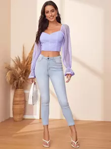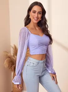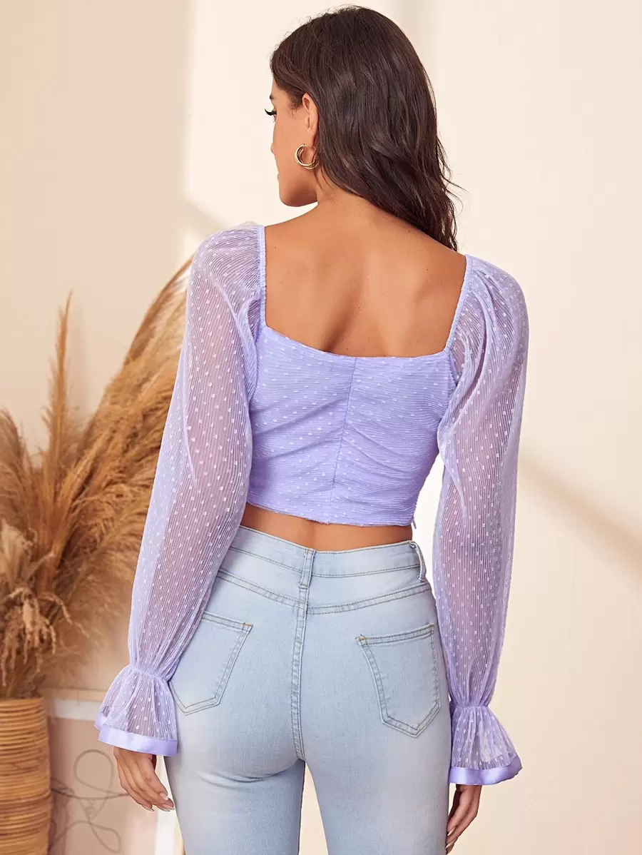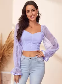Sweetheart Neck Flounce Sleeve Swiss Dot Crop Top
