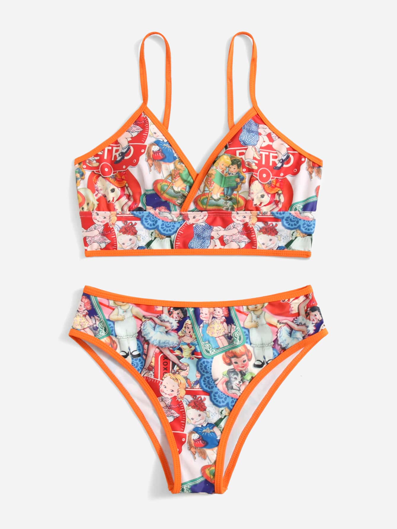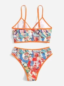 Sweetness Cartoon Figure Print Contrast Binding Bikini Set Summer Beach