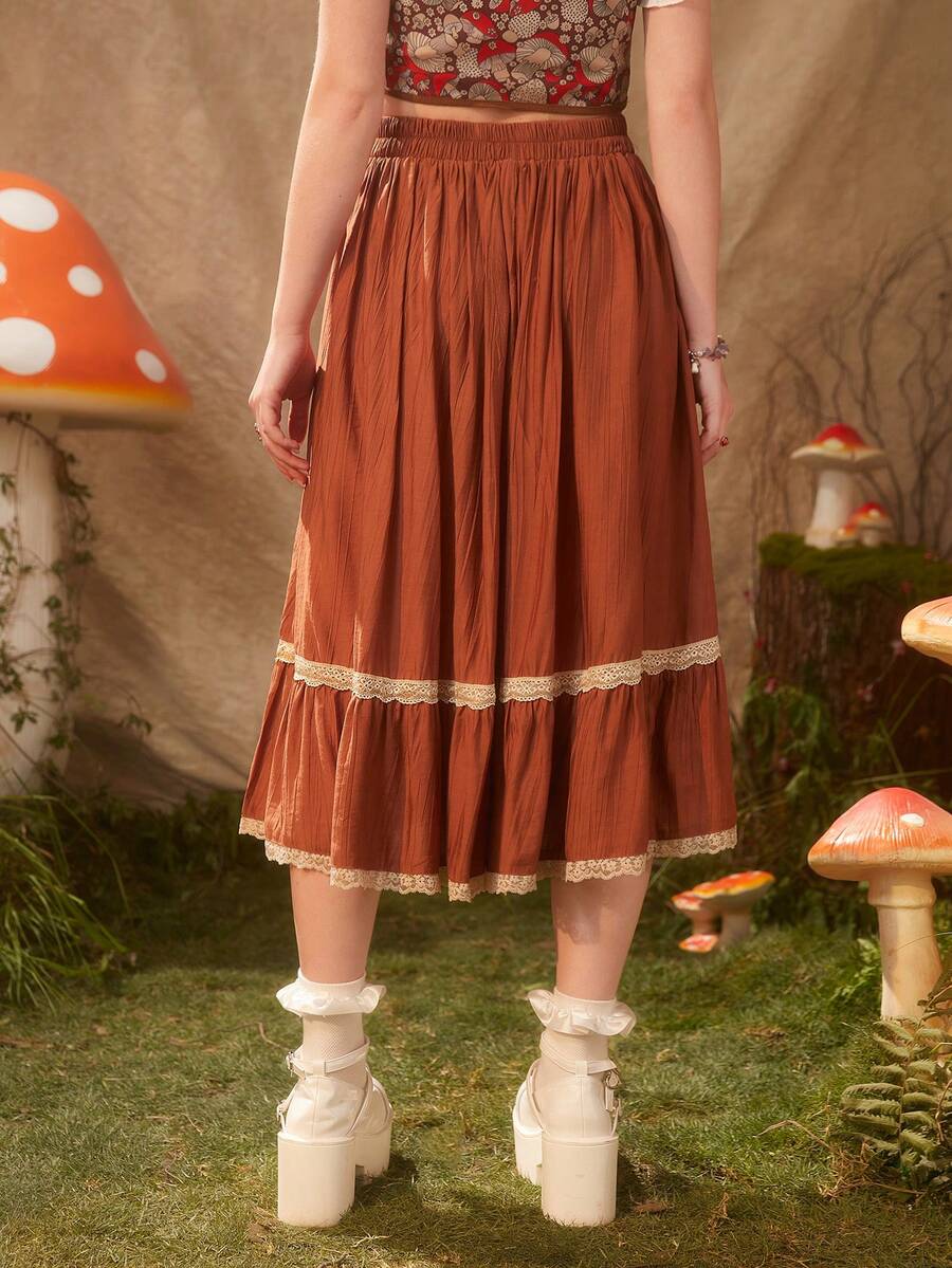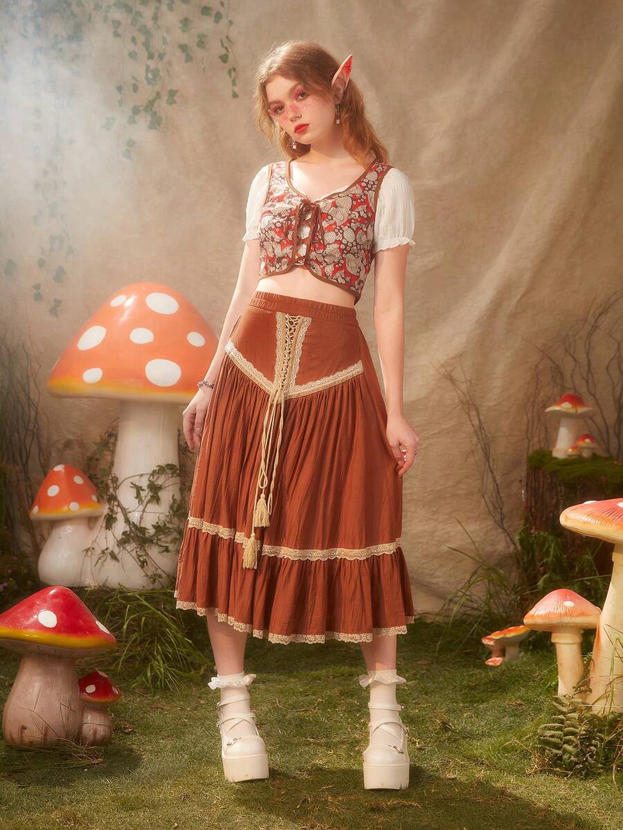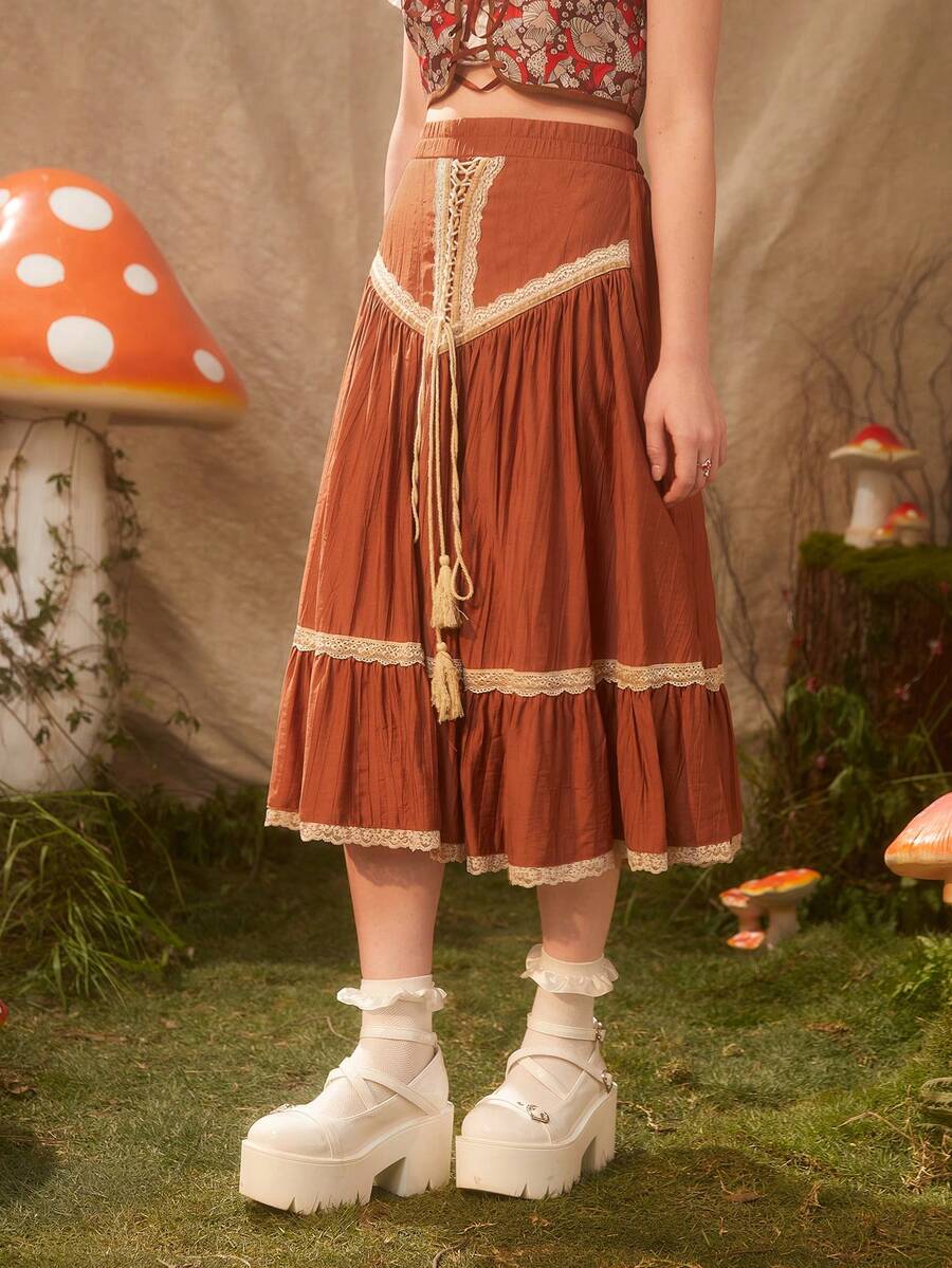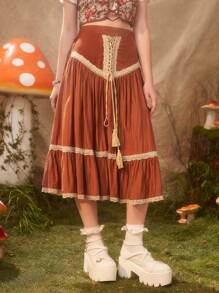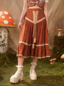 Fairycore Contrast Lace Tassel Tie Front Ruffle Hem Skirt