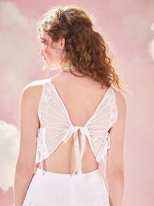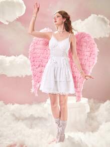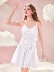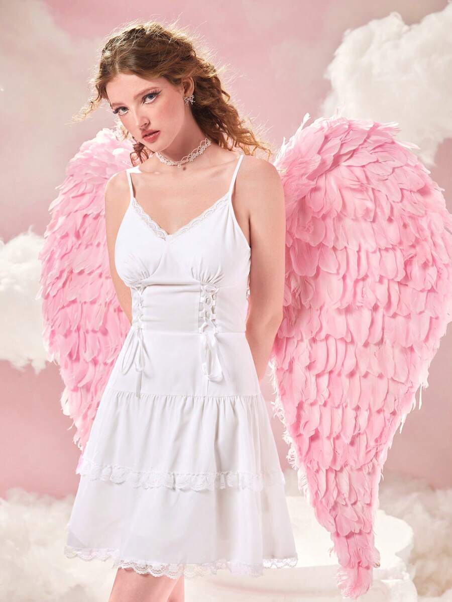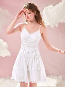 Contrast Lace Tie Backless Ruffle Hem Cami Dress