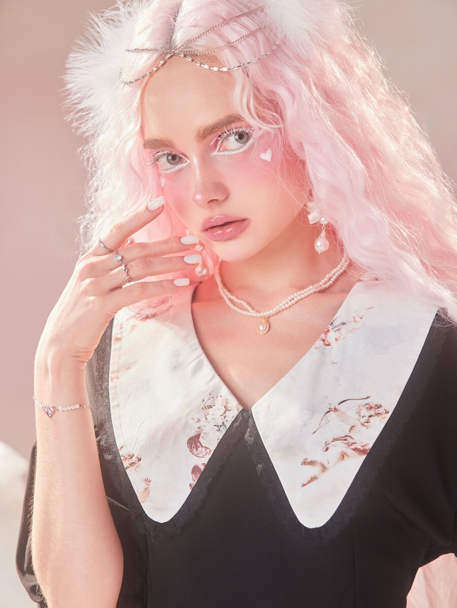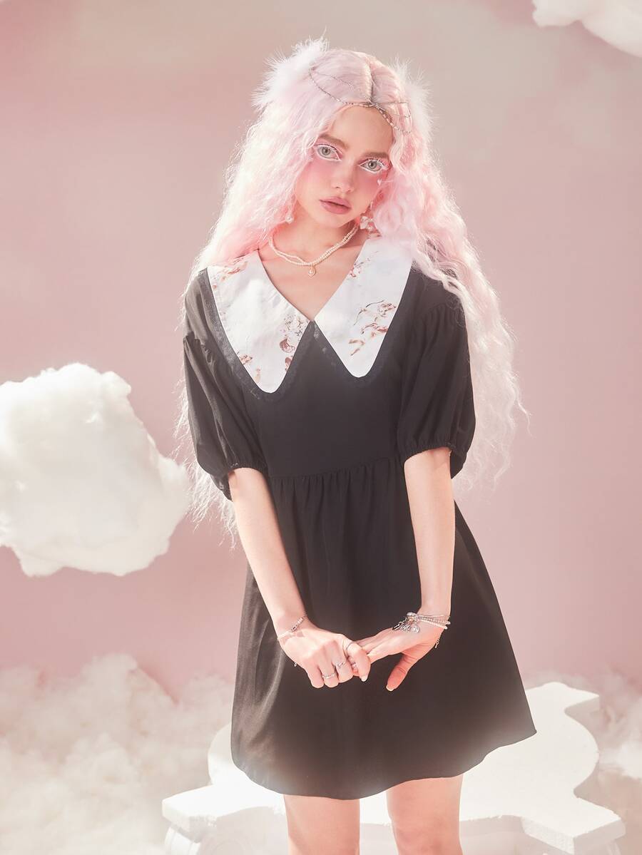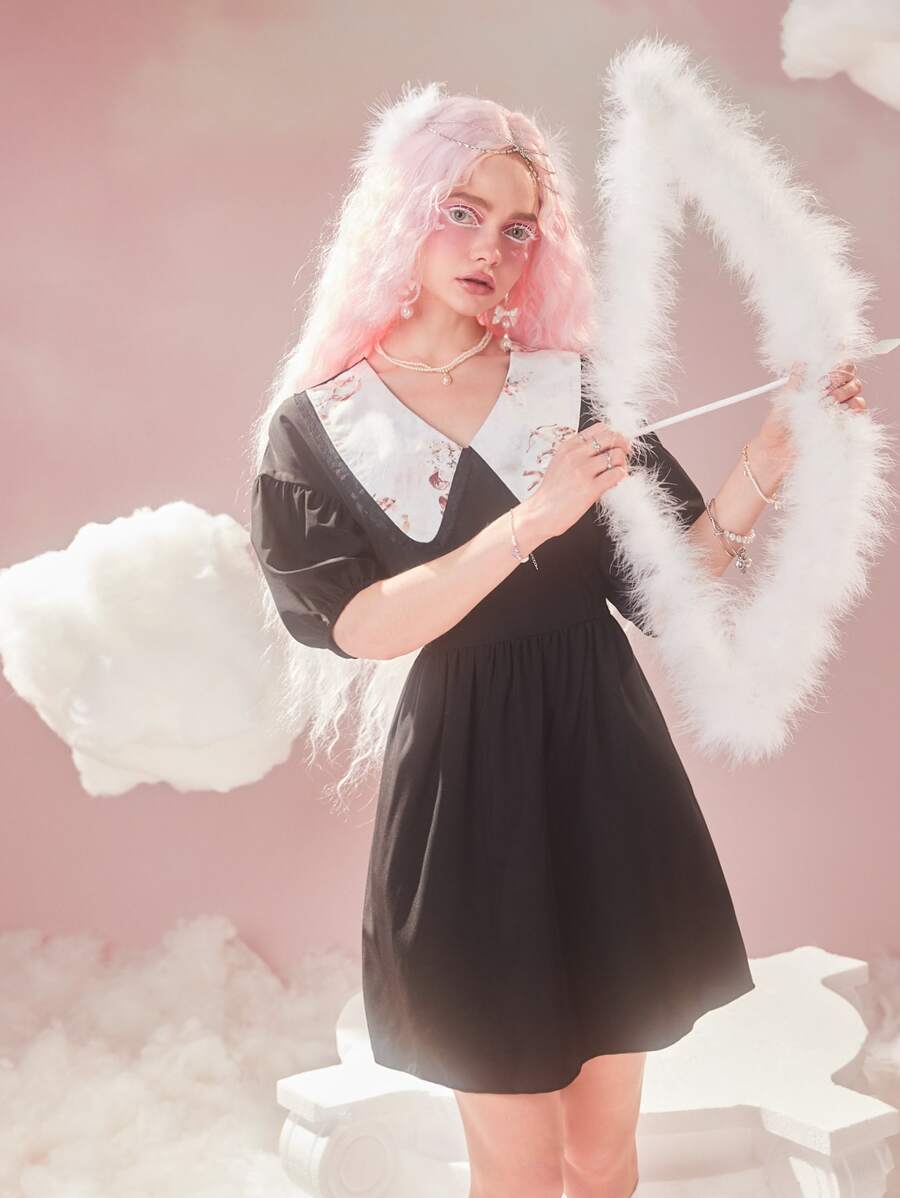 Cupid Print Contrast Collar Tie Backless Puff Sleeve Dress