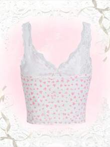 Heart Print Lace Trim Cami Top