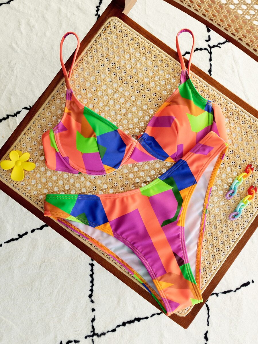 Swim Suits For Women Summer Beach Colorful Geo Print Bikini Set Buckle Underwire Push Up Bra & Bikini Bottom 2 Piece Bathing Suit