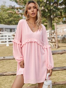 Swiss Dot Ruffle Trim V-neck Smock Dress