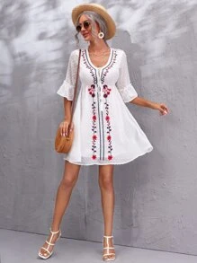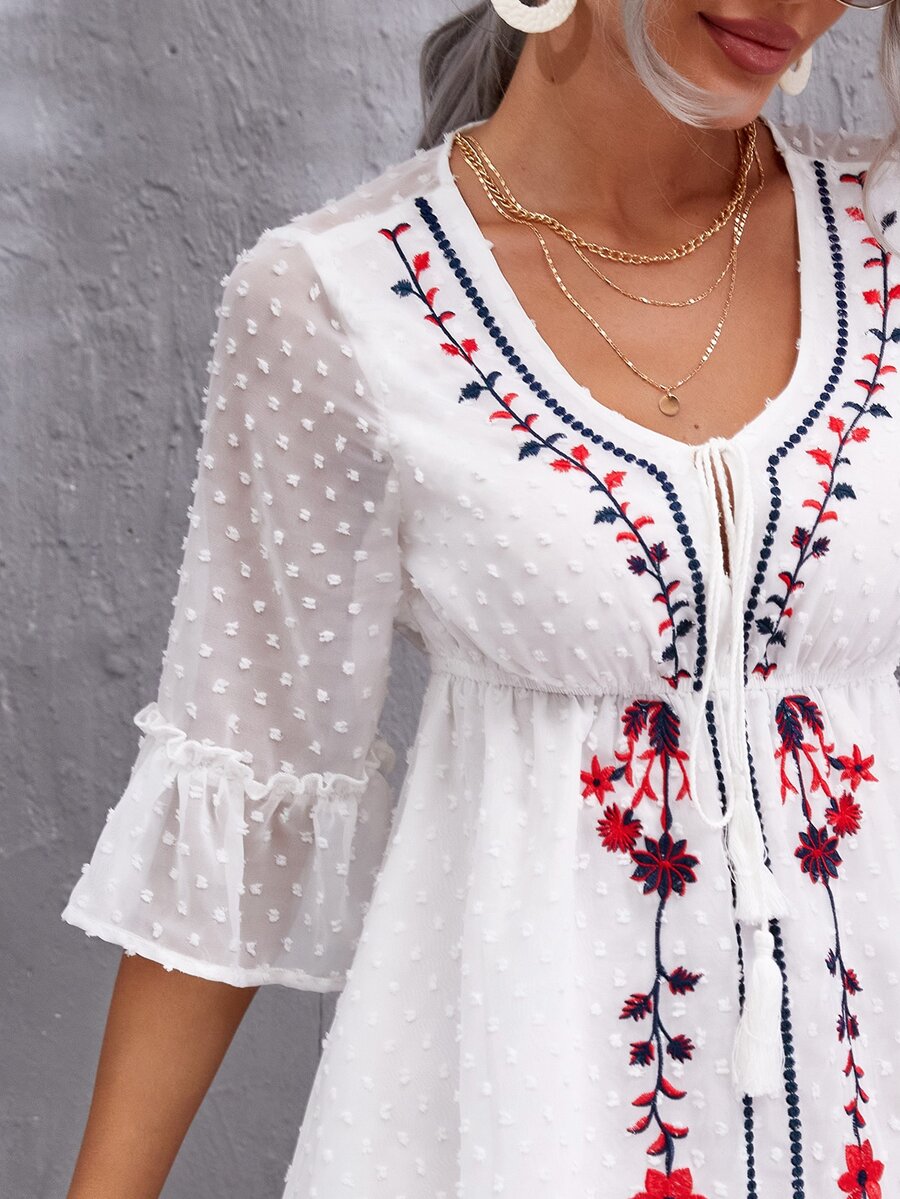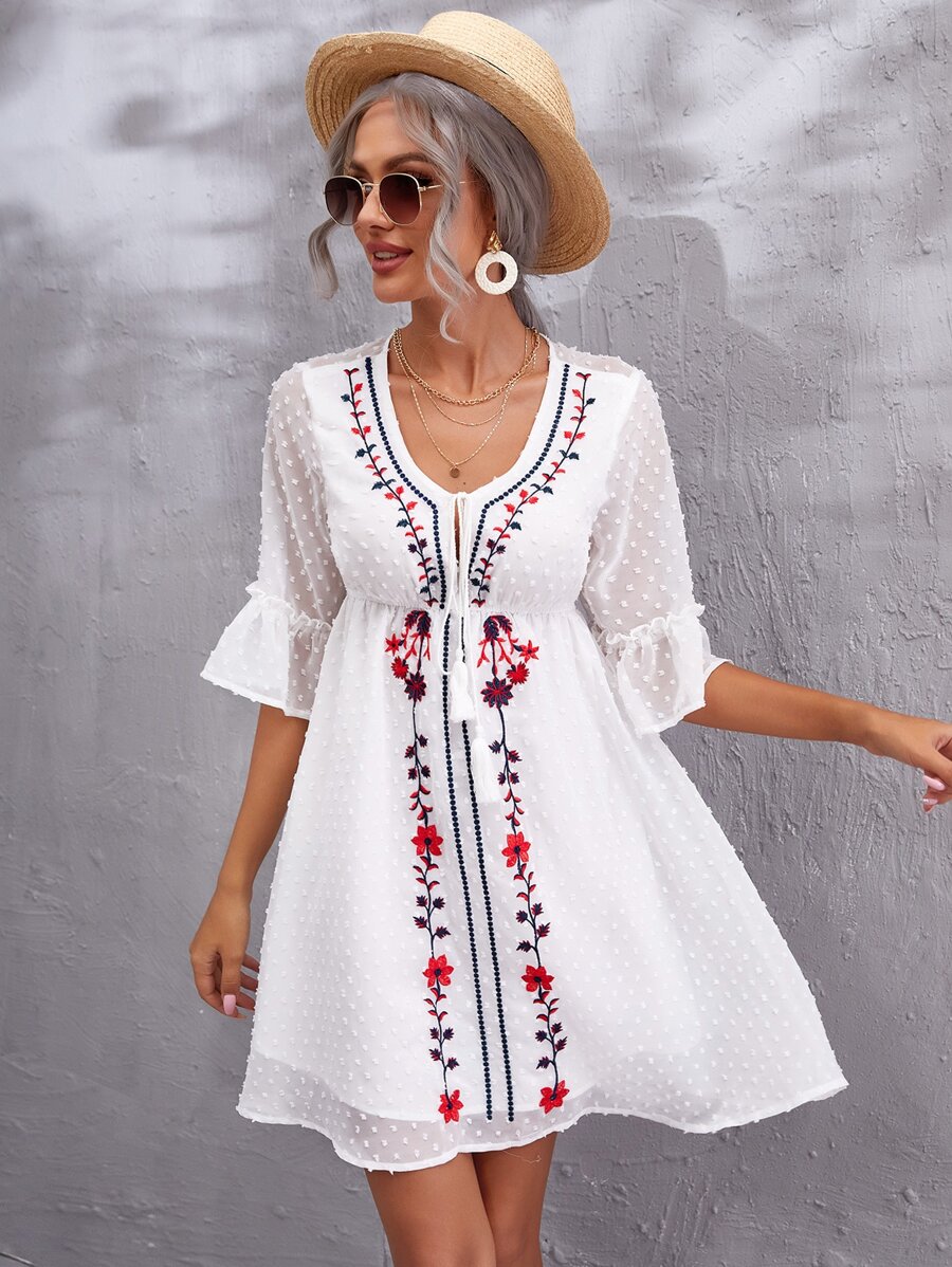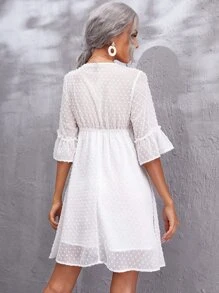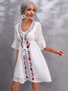 Tassel Tie Front Bell Sleeve Floral Embroidered Swiss Dot Dress