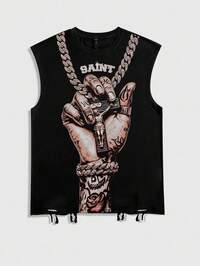Street Life Vintage Distressed Gothic Cross & Virgin Mary Print Sleeveless Tank Top, 2000s Streetwear Style