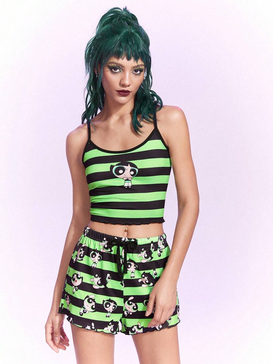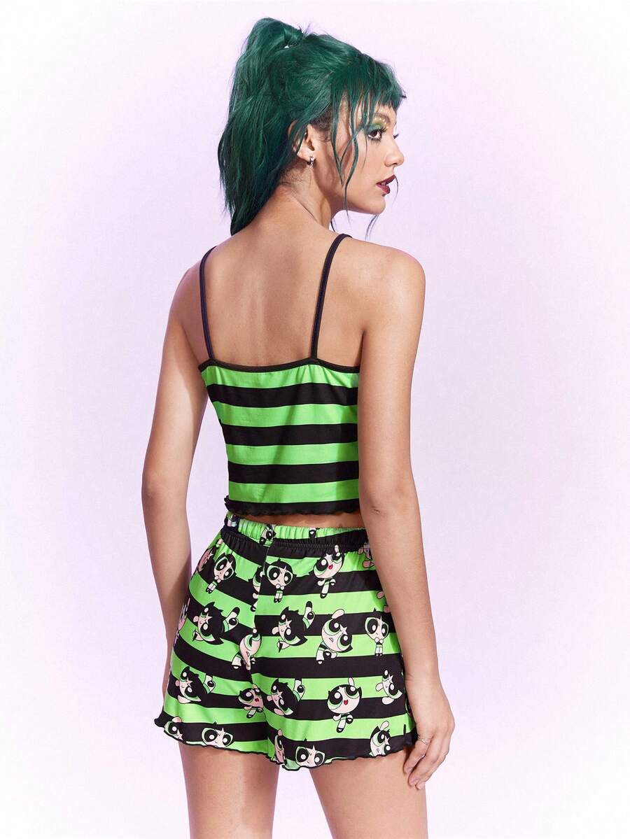 The Powerpuff Girls | ROMWE Striped & Cartoon Graphic Contrast Binding PJ Set