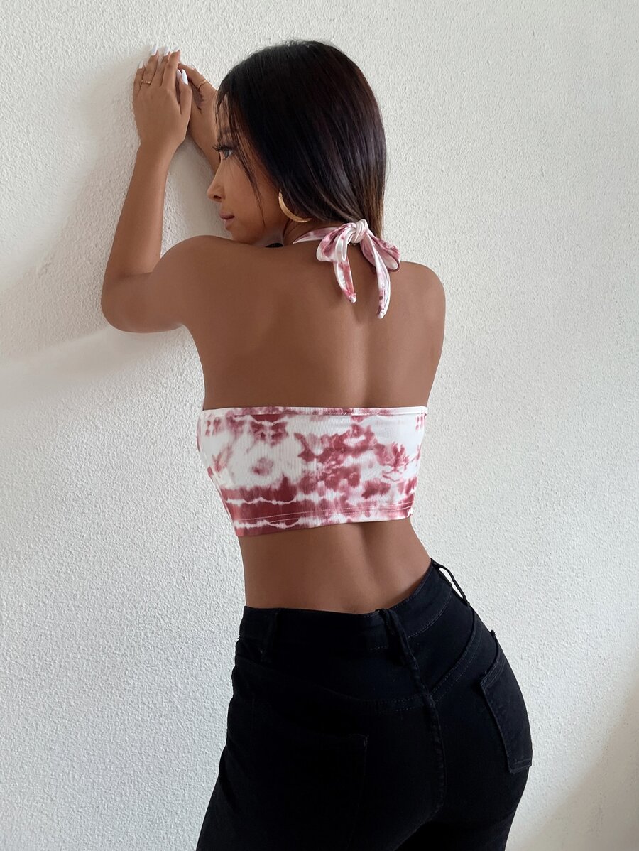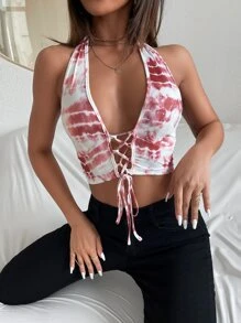 Tie Dye Lace Up Front Crop Halter Top