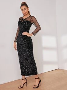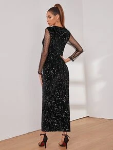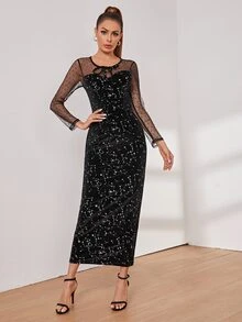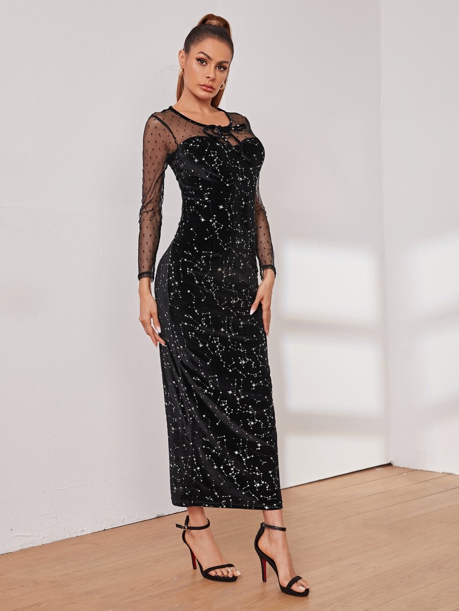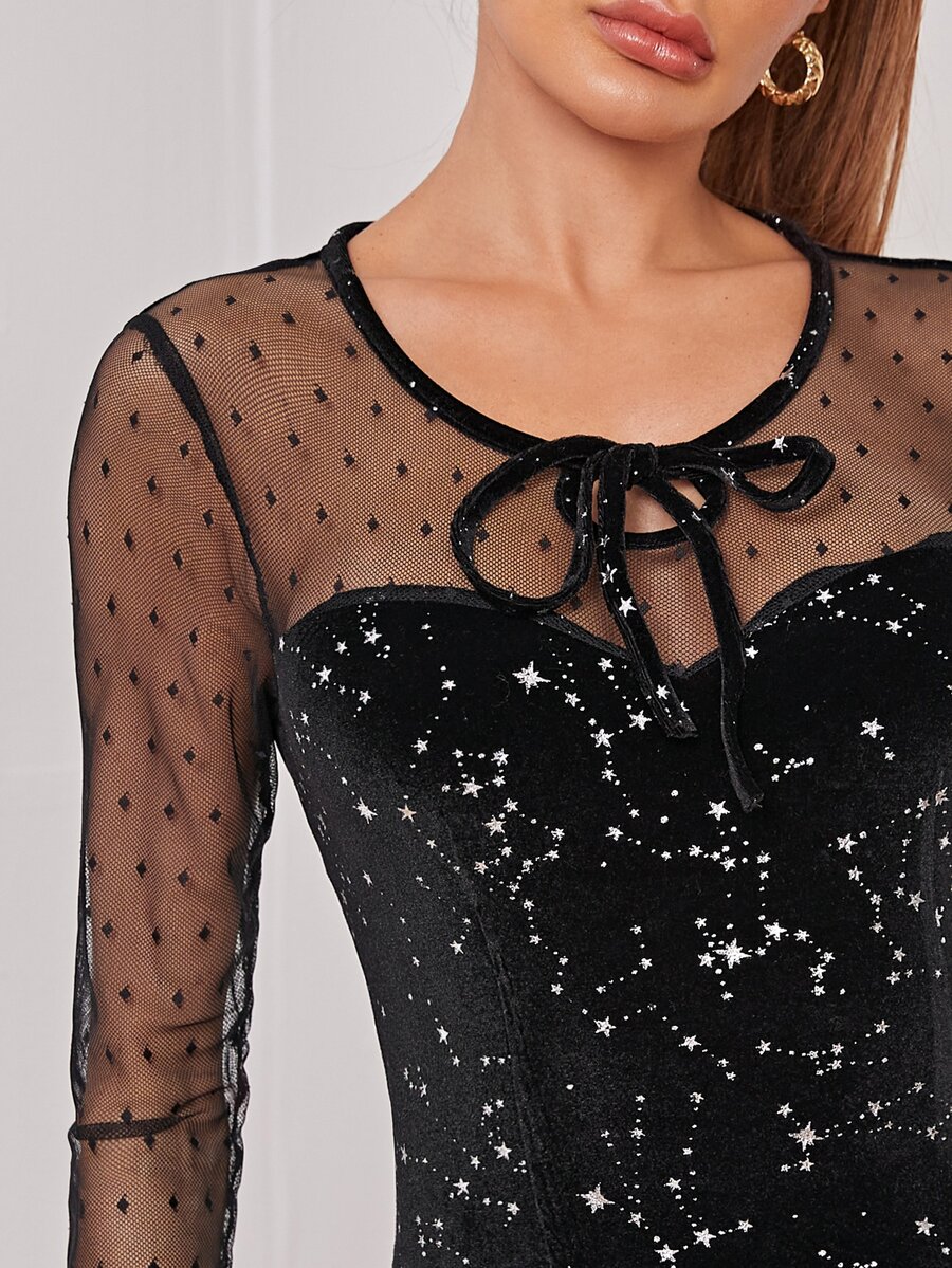 Tie Neck Mesh Panel Galaxy Print Velvet Dress