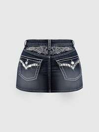 J-Fashion Y2K Style Plus Size Women's Low Waist Denim Mini Skirt With Wings Embroidery And Rhinestone Decoration, For Summer