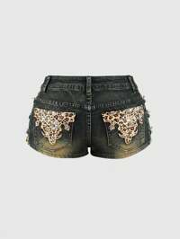 Grunge Punk Women Kpop Y2K Party Denim Shorts With Super Low Waist, Leopard Print Embroidery, Concert/Festival