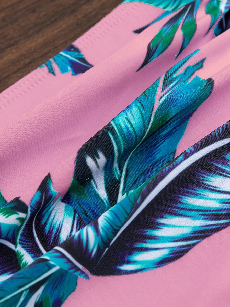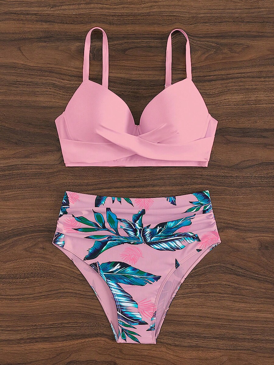 Tropical Print Bikini Set Criss Cross Front Underwire Bra & Tummy Control High Waisted Bottom 2 Piece Bathing Suit