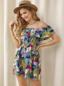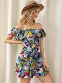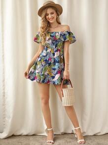 Tropical Print Off Shoulder Ruffle Detail Dress