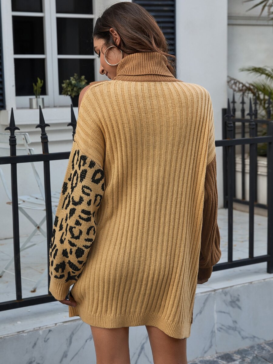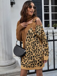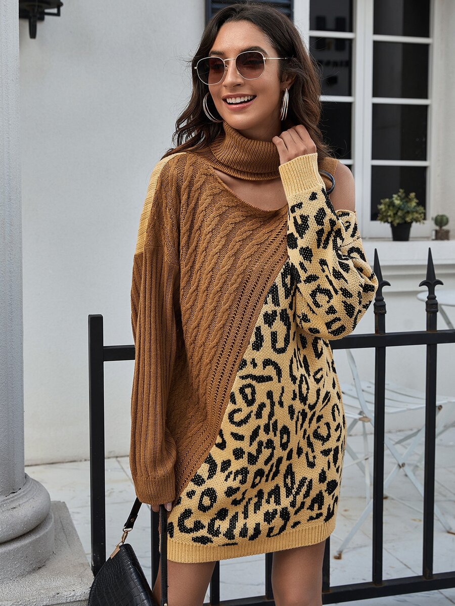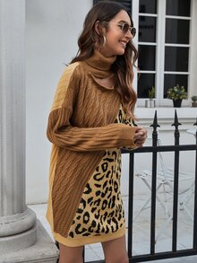 Turtleneck Cut-out Buckle Detail Cable Knit Leopard Sweater Dress
