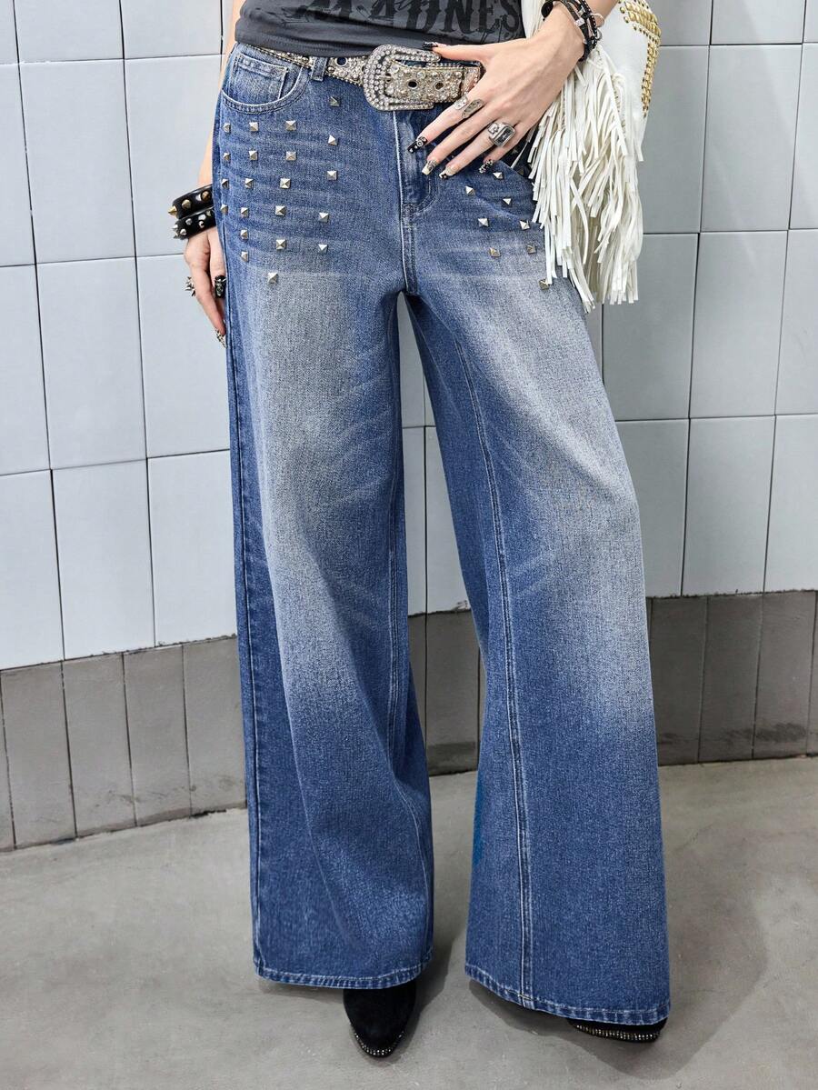 Unisex Y2K Grunge Punk Distressed Cat Whisker Rivet Decor Loose Straight Leg Jeans