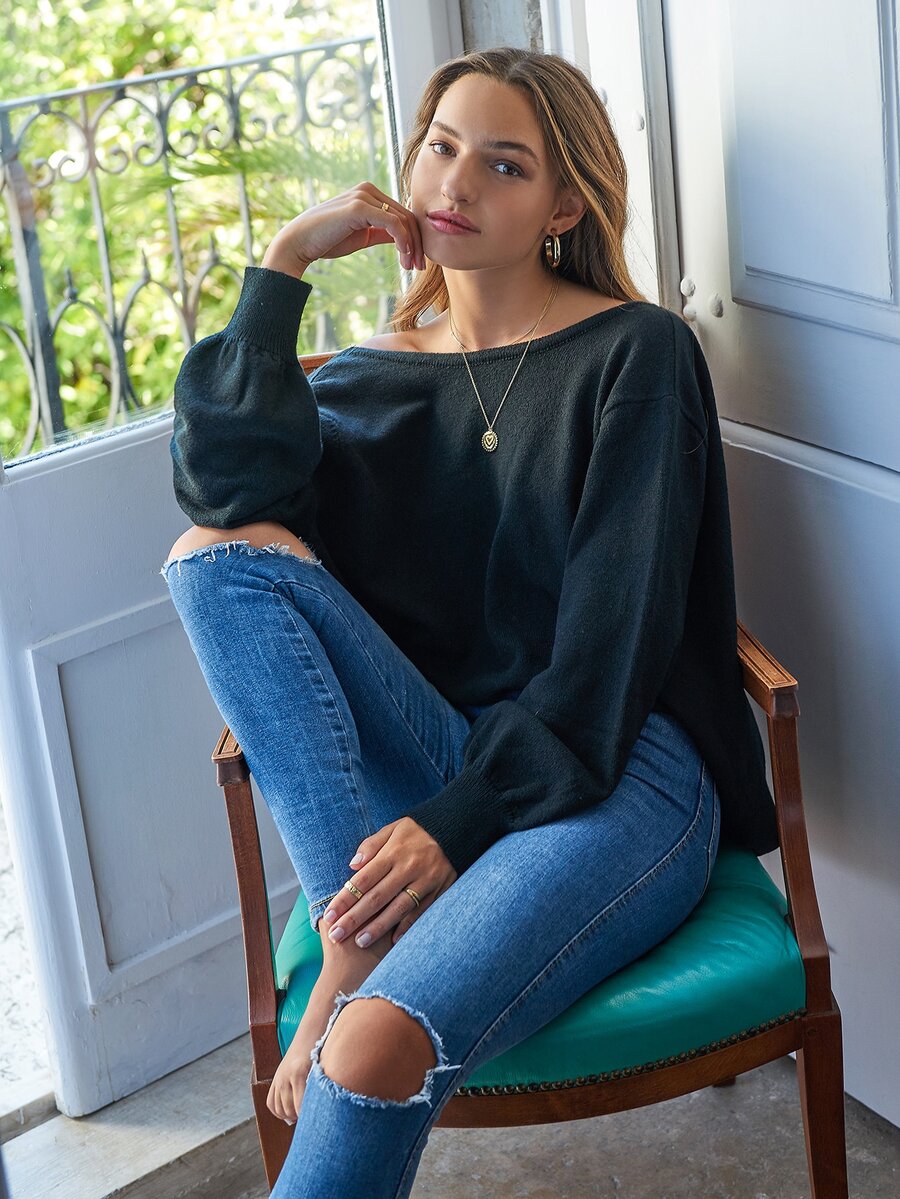 V-Cut Lace Back Dolman Sleeve Sweater