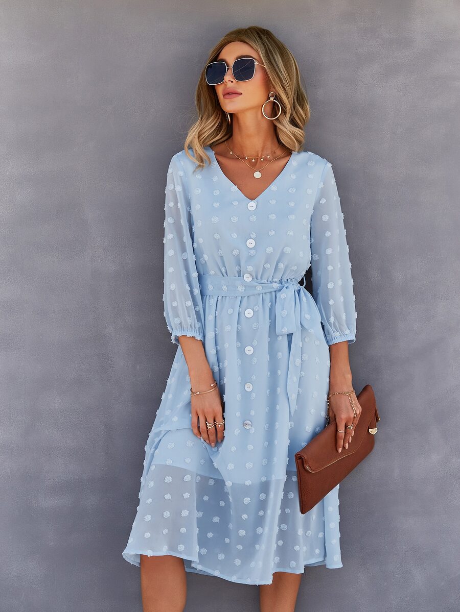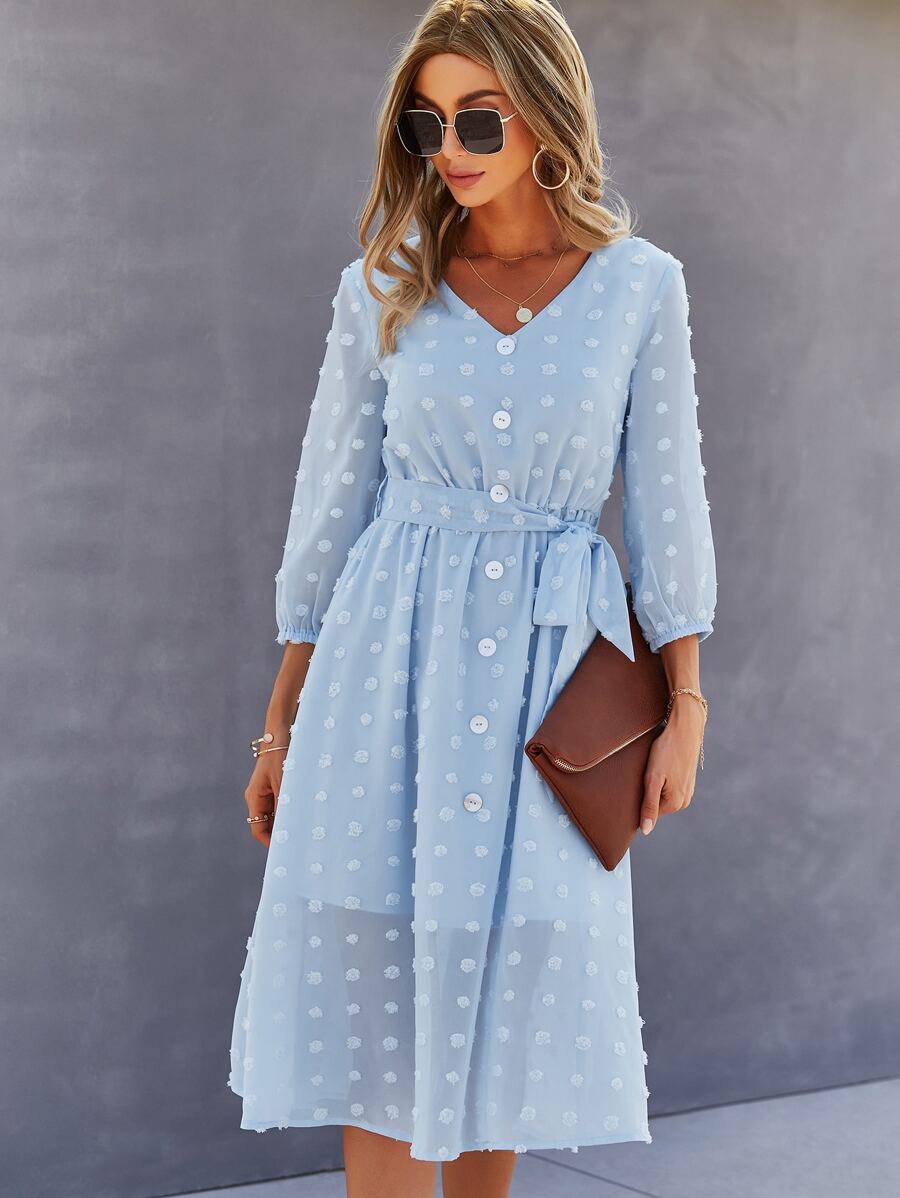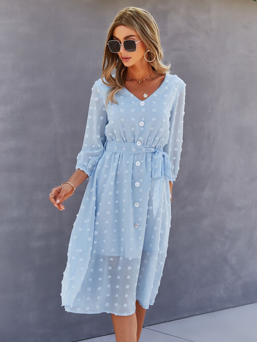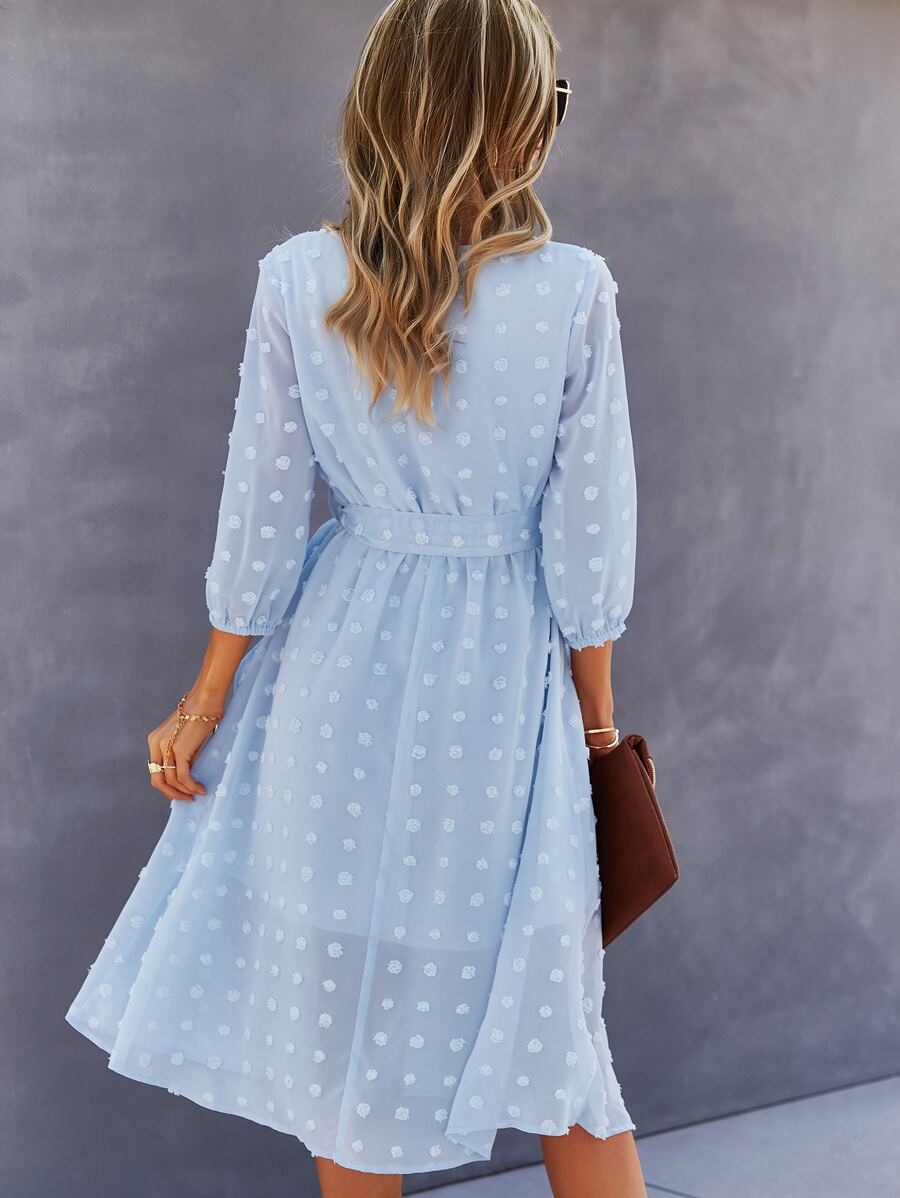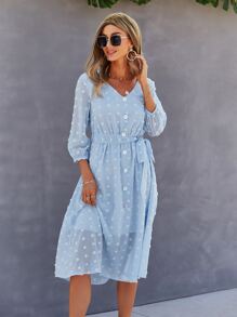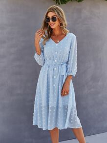V-neck Swiss Dot Self Tie Chiffon Dress