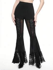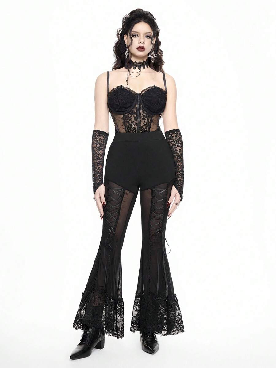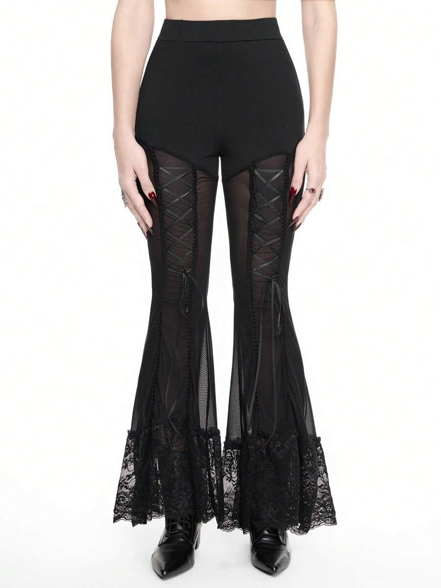 Valentine's Day Vintage Gothic Sheer Mesh Patchwork Leg Tie Lace Ruffle Flare Pants For Women