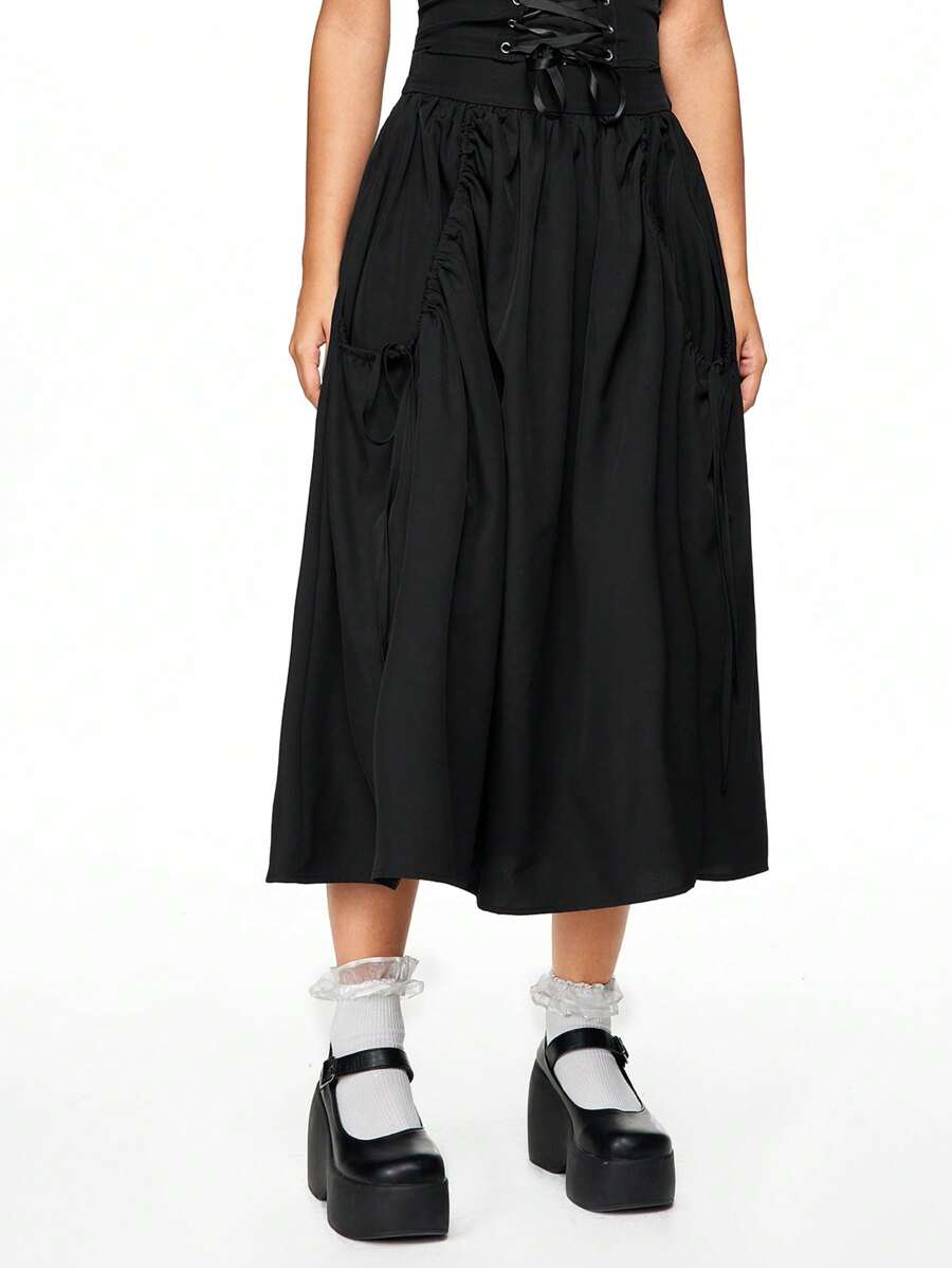 Versatile Solid Color Drawstring Waist With Big Pockets A-Line Midi Skirt