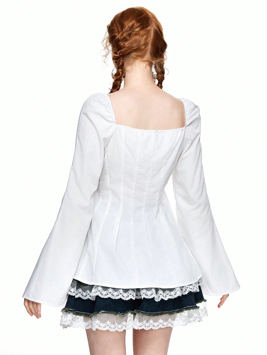 Versatile Sweet Bow Tie Cuff Flare Sleeve Button Down Collared Women Shirt