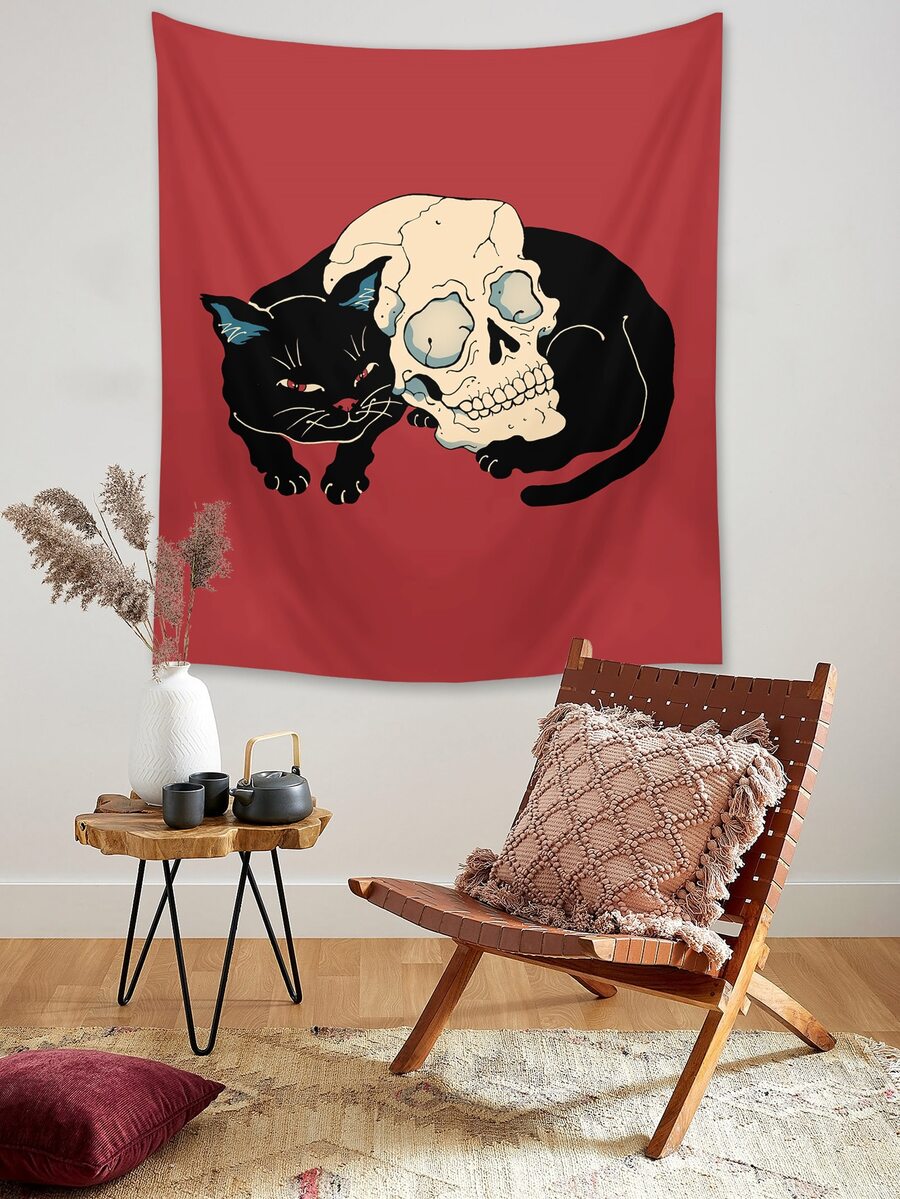Vincenttrinidadart Retro Cat & Skeleton Print Tapestry