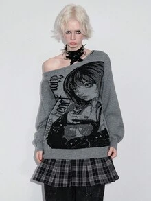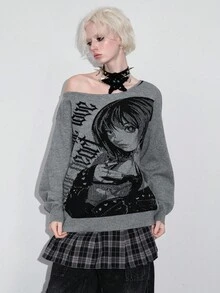 Anime Vintage Anime Character Print Loose Asymmetrical Shoulder Sweater For Women