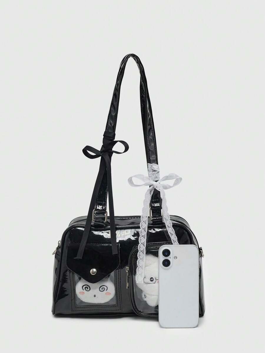 Kawaii Vintage Cute Style Women's Plaid Shoulder Bag With Bowknot, Cherry & Heart Decoration, Multi-Pocket Boston Bag, School, Street & Japanese Bag For Women