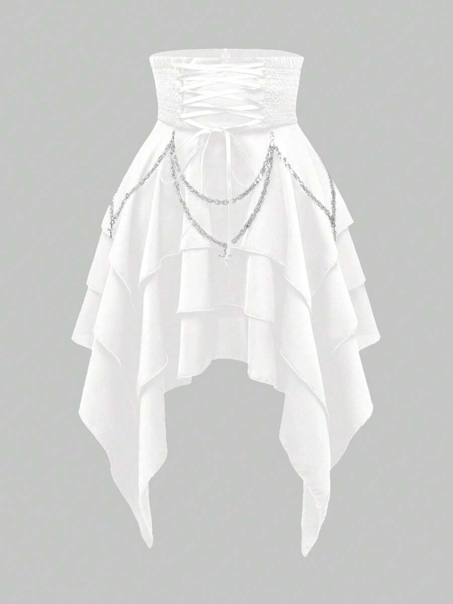 Vintage Gothic High Waist Detachable Metal Chain Super High Waist Lace-Up Cinched Waist Asymmetrical Multilayer Hem Women Skirt