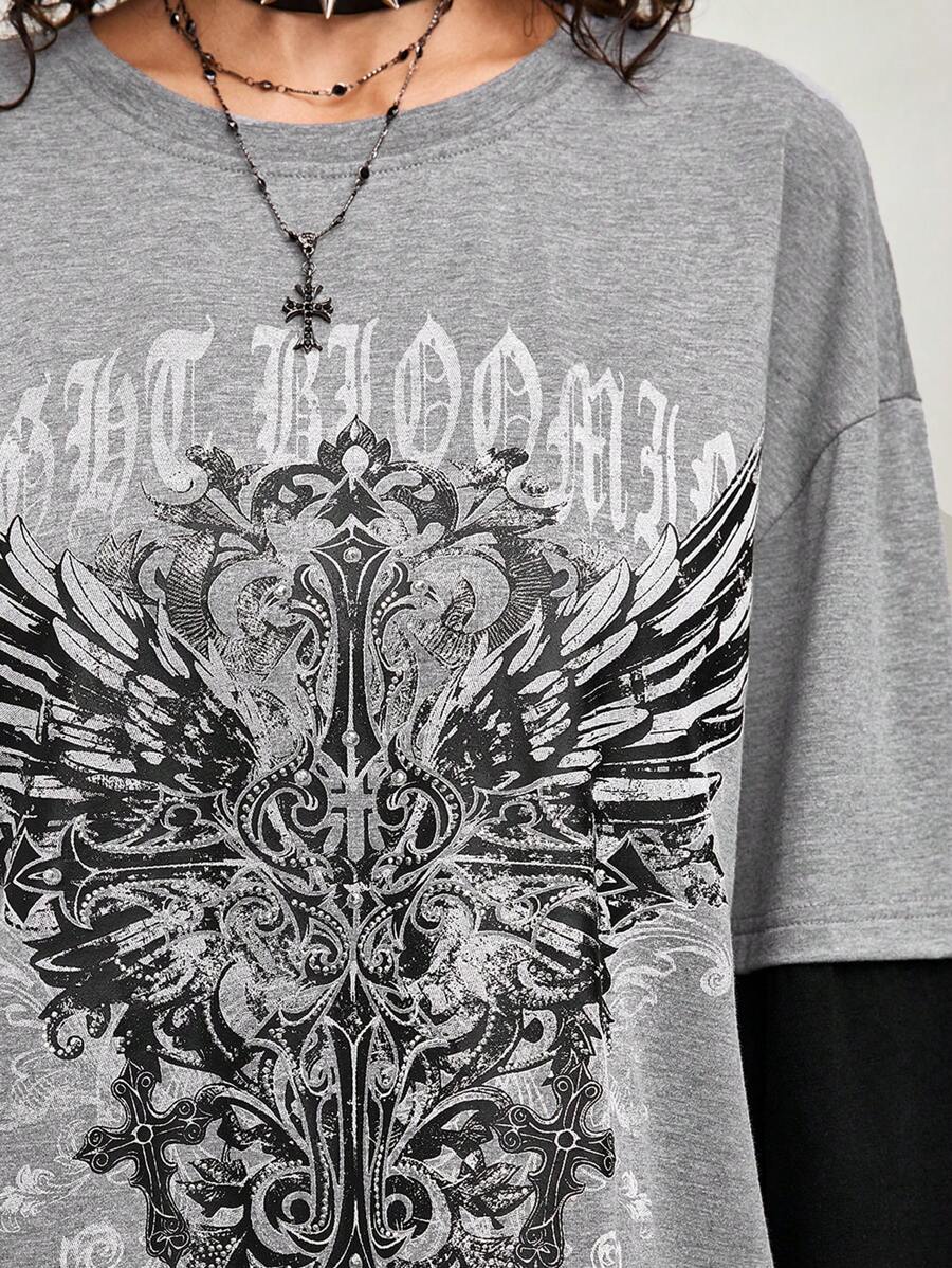 Grunge Punk Vintage Grunge Vine & Cross Rhinestone Print 2 In 1 Long Sleeve T-Shirt