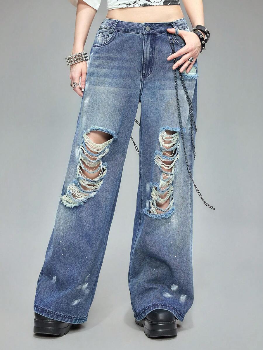 Grunge Punk Vintage Grunge Y2K Chain Decor Distressed Loose Women Ripped Jeans