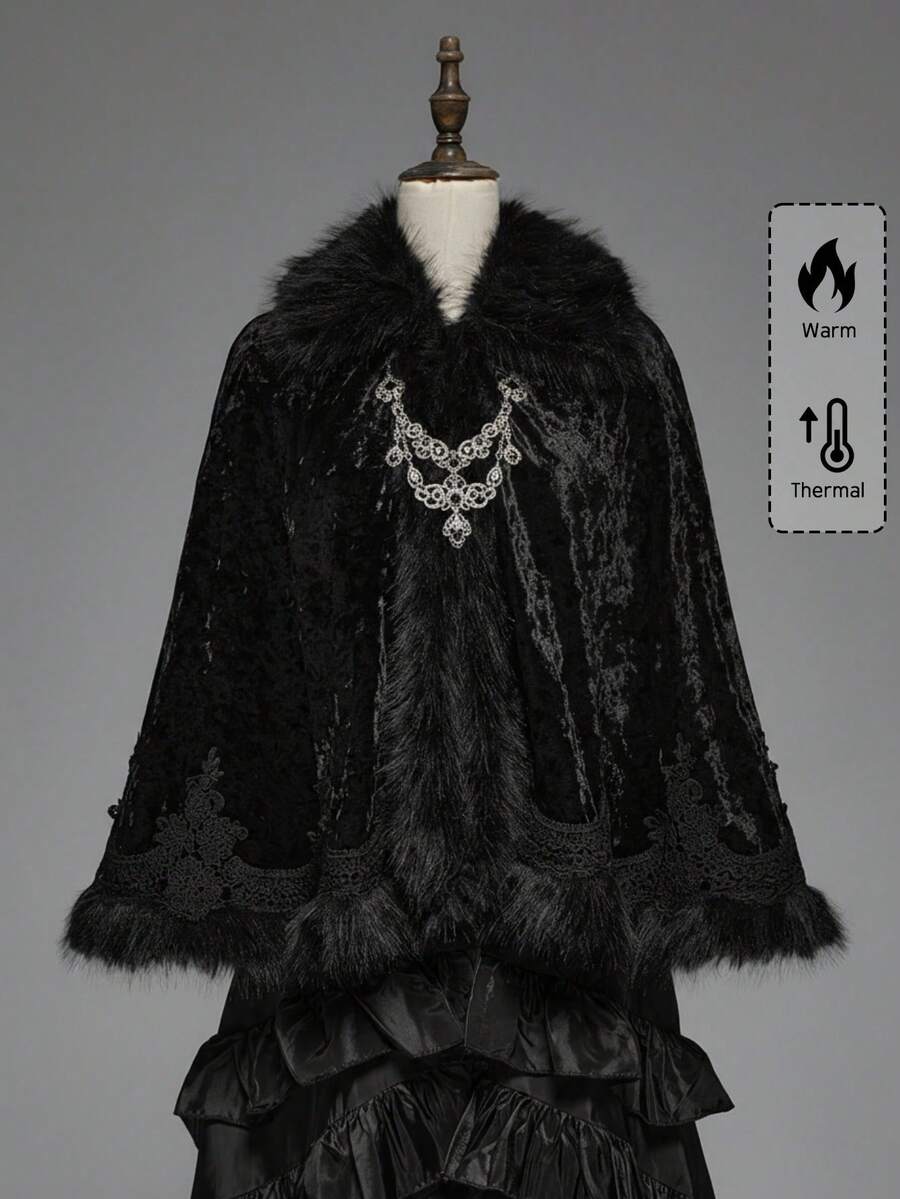 Goth Vintage Palace Patchwork Faux Fur Collar Diamond Velvet Lace Trim Gothic Cloak