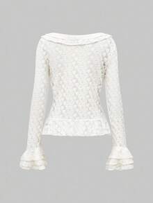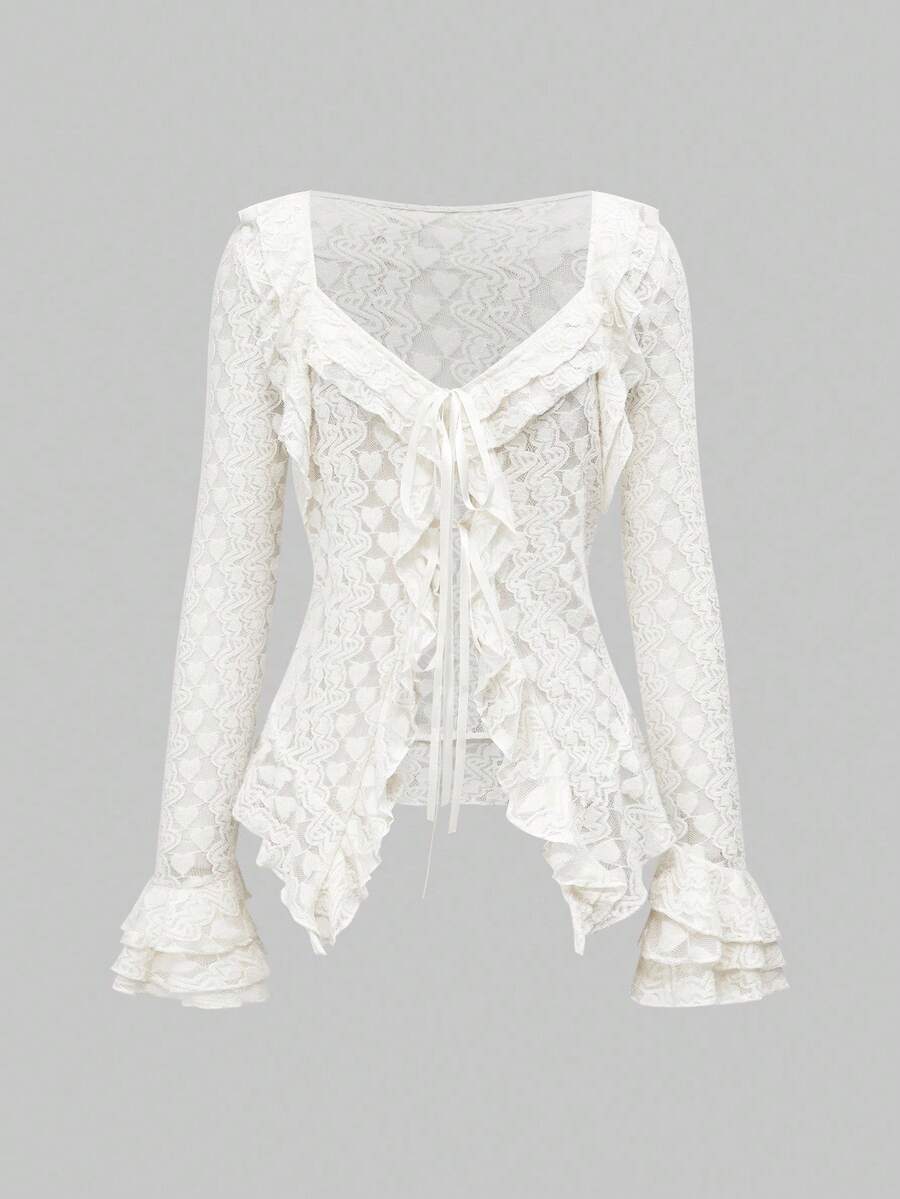 Grunge Punk Vintage Palace Sensual Slouchy Texture Ruffle Trim Fitted Feather Mesh Lace Blouse With Bell Sleeves