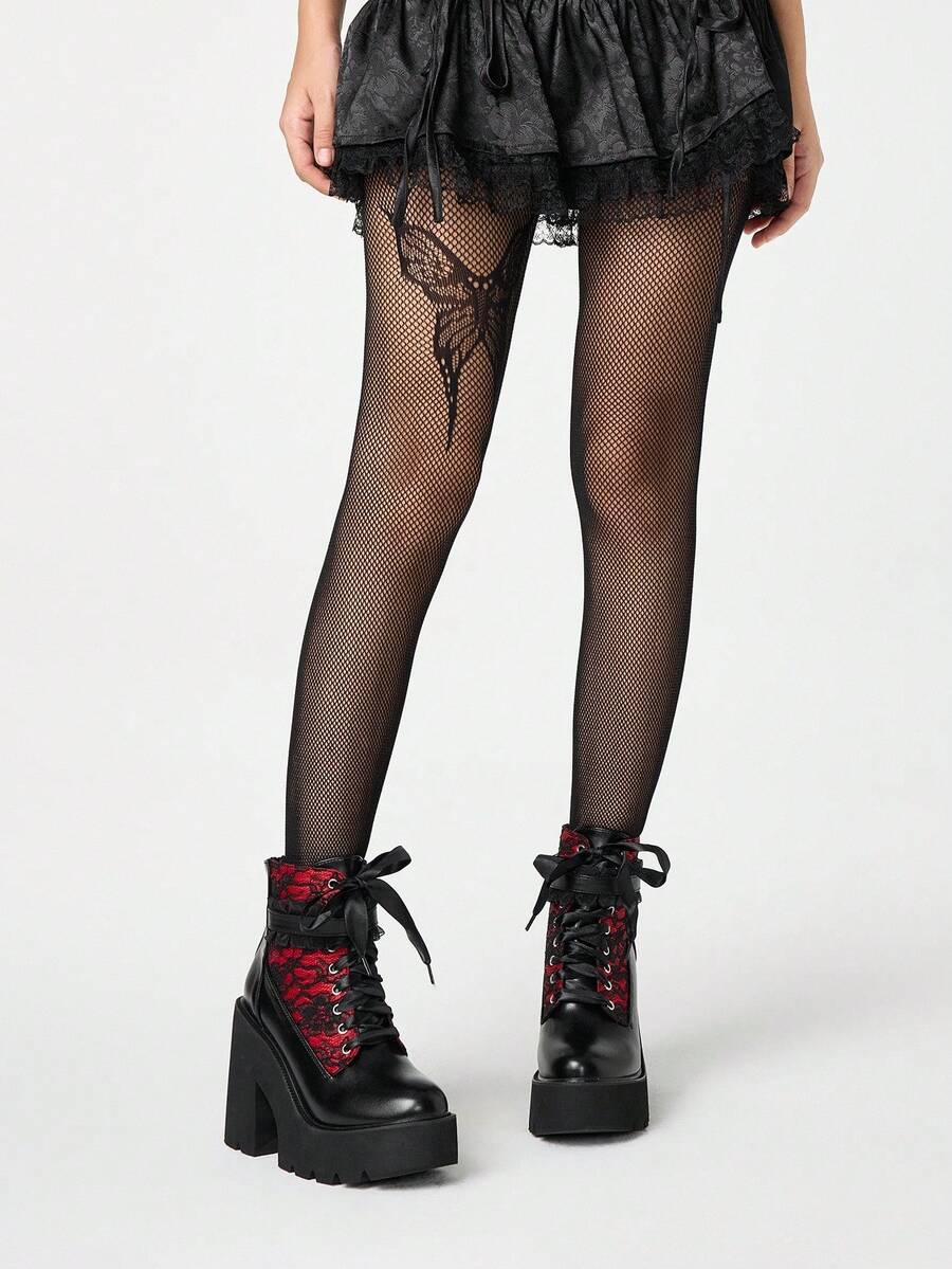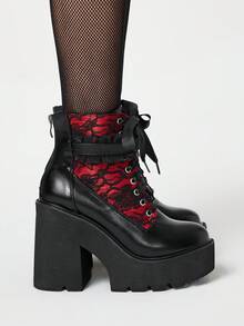 Grunge Punk Vintage Red Lace Chunky Heel Ankle Boots Sexy Black Embroidered Platform Goth/Punk Style Buckle Ankle Boots