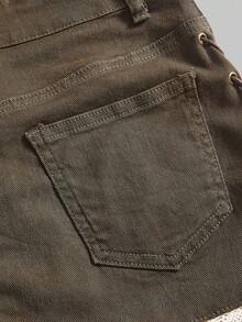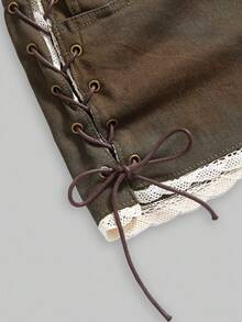 ROMWE Avant Vintage Rustic Girl Distressed Denim Lace Patchwork Tie-Up Mini Personalized Low Waist Denim Skirt For Women