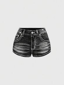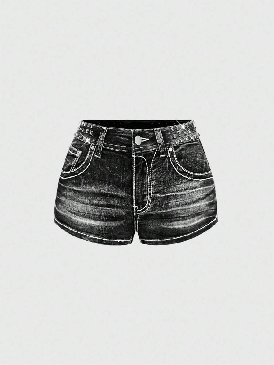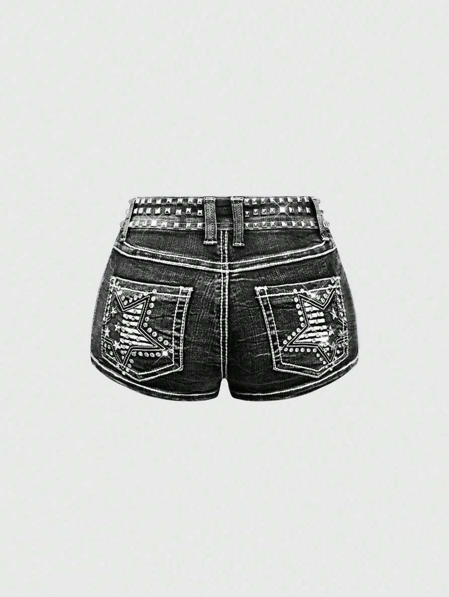 Grunge Punk Vintage Y2K Distressed Star Rhinestone Decor Super Low Waist Mini Denim Shorts, Versatile For Multiple Occasions