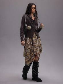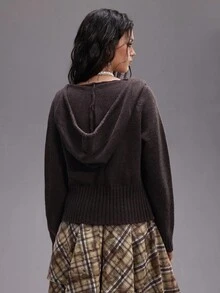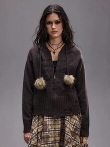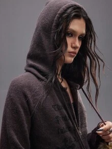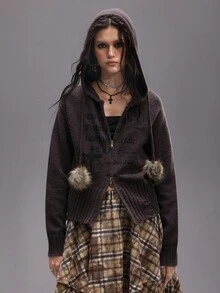 Grunge Punk Vintage Y2K Fuzzy Patchwork Women Knitted Zip-Up Hooded Cardigan