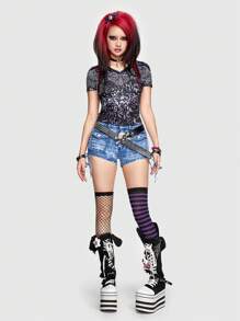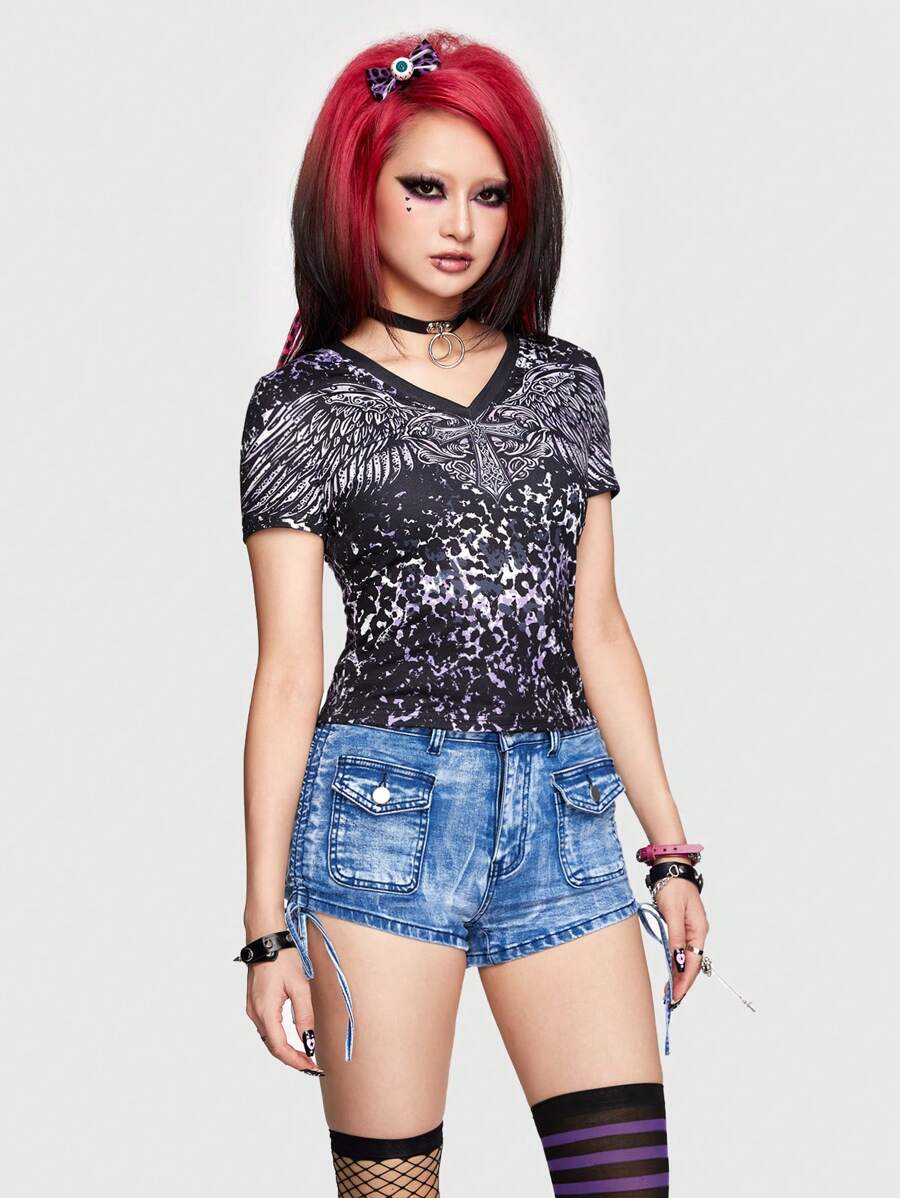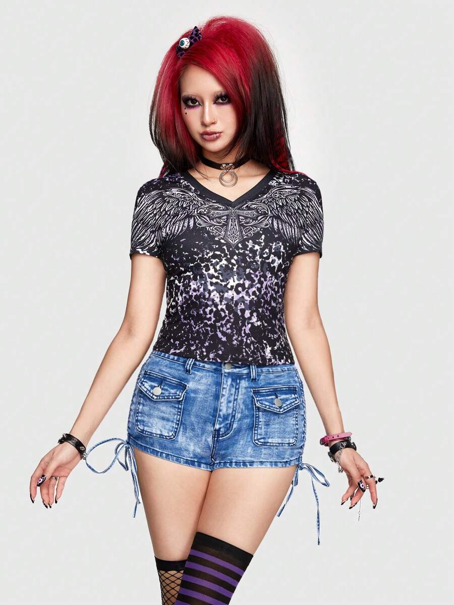 ROMWE Avant Vintage Y2k Tie-Dye Purple Leopard Print Cross Design Slim Fit V-Neck Woman T-Shirt With Waistband