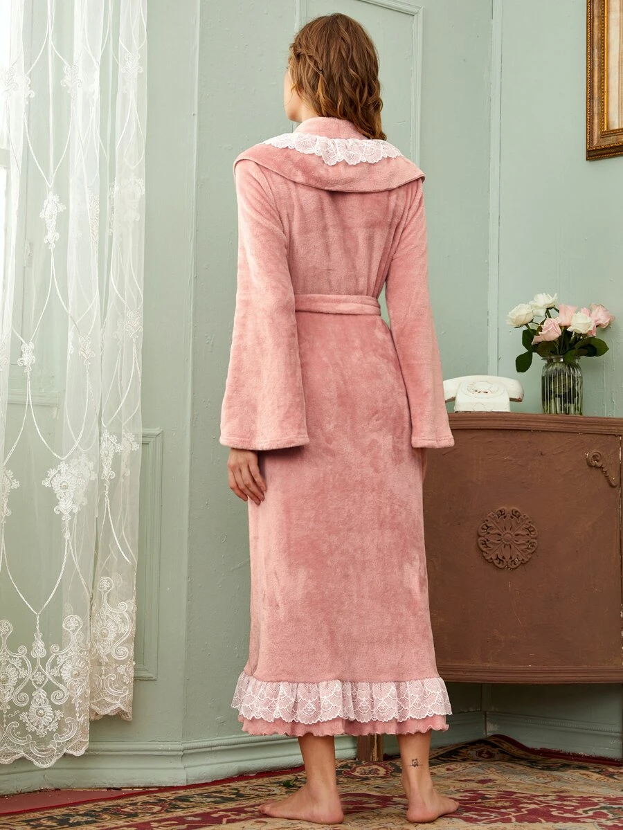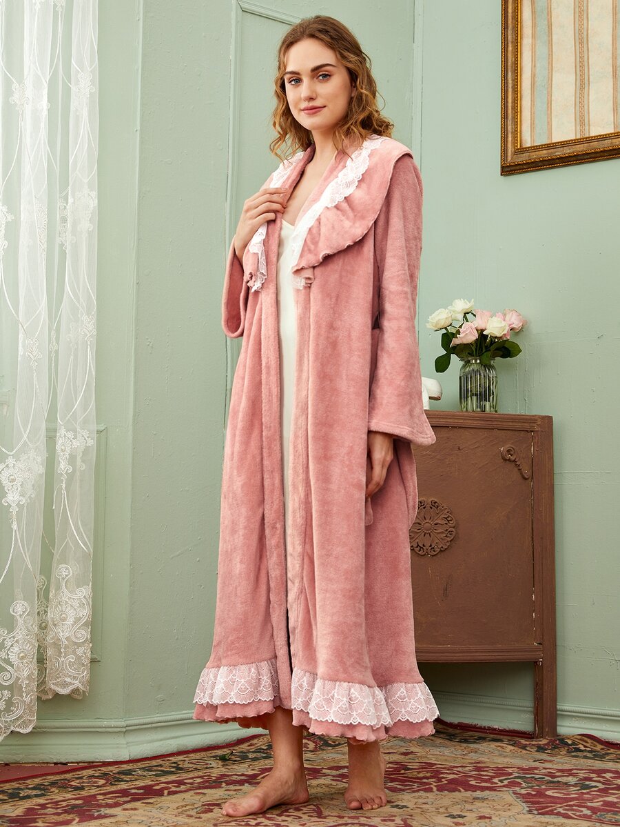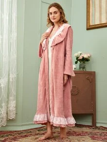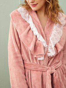 Waterfall Collar Lace Ruffle Trim Belted Teddy Robe