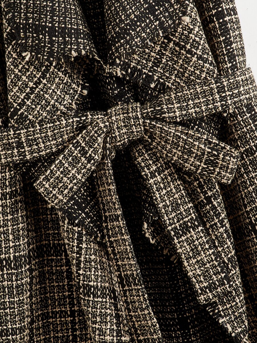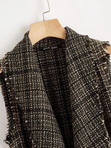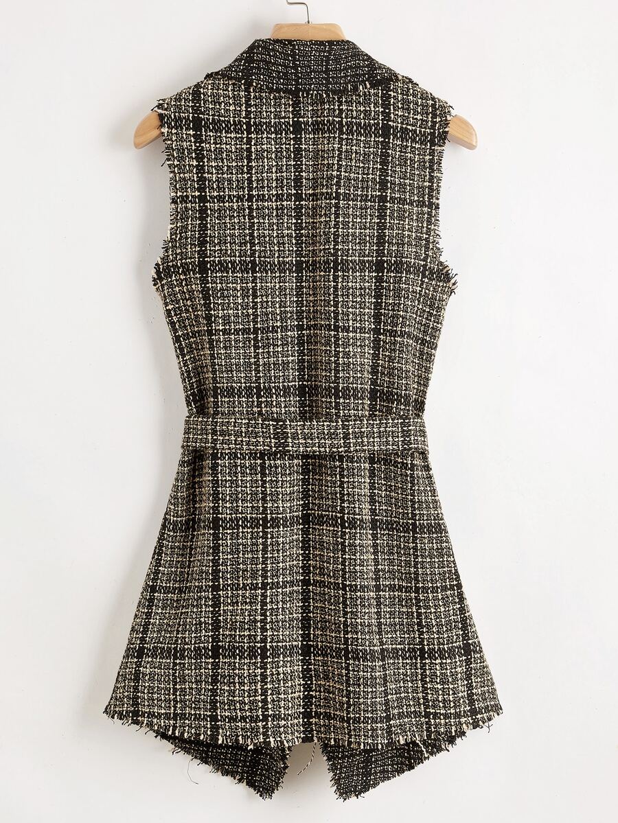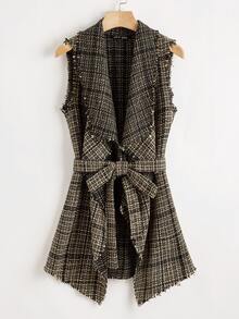 Waterfall Neck Raw Hem Belted Tweed Vest Coat