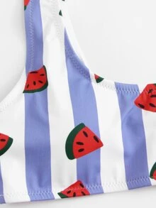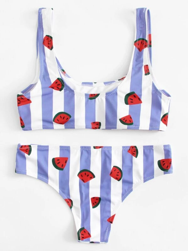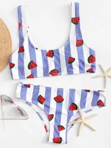 Watermelon Print Striped Scoop Neck Bikini