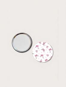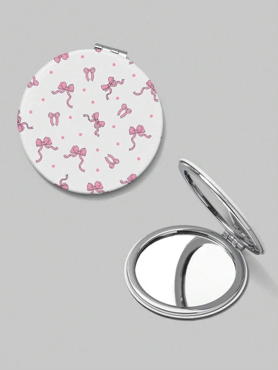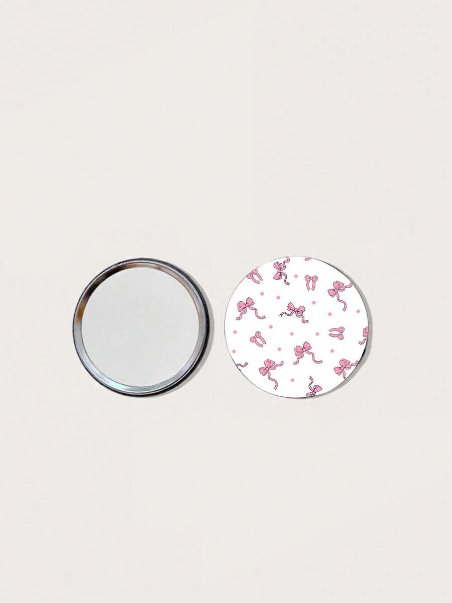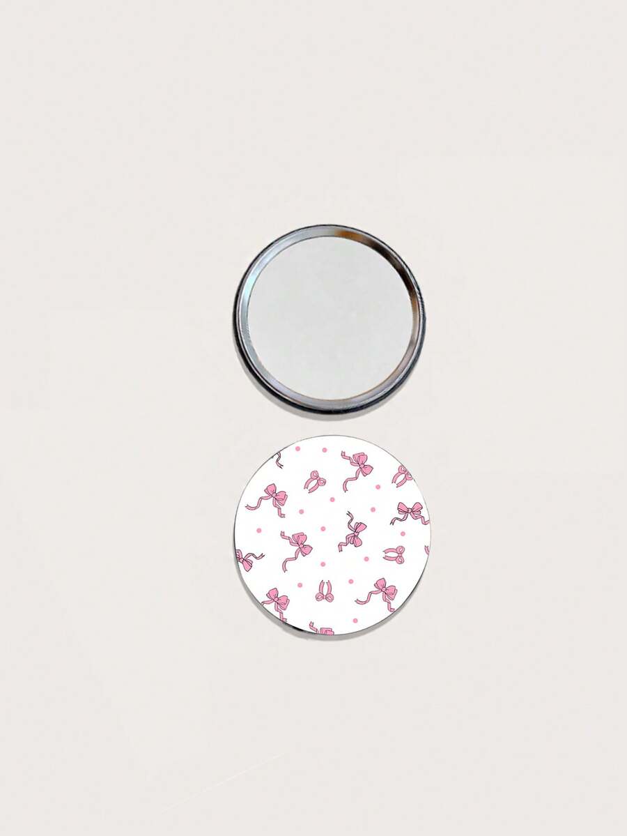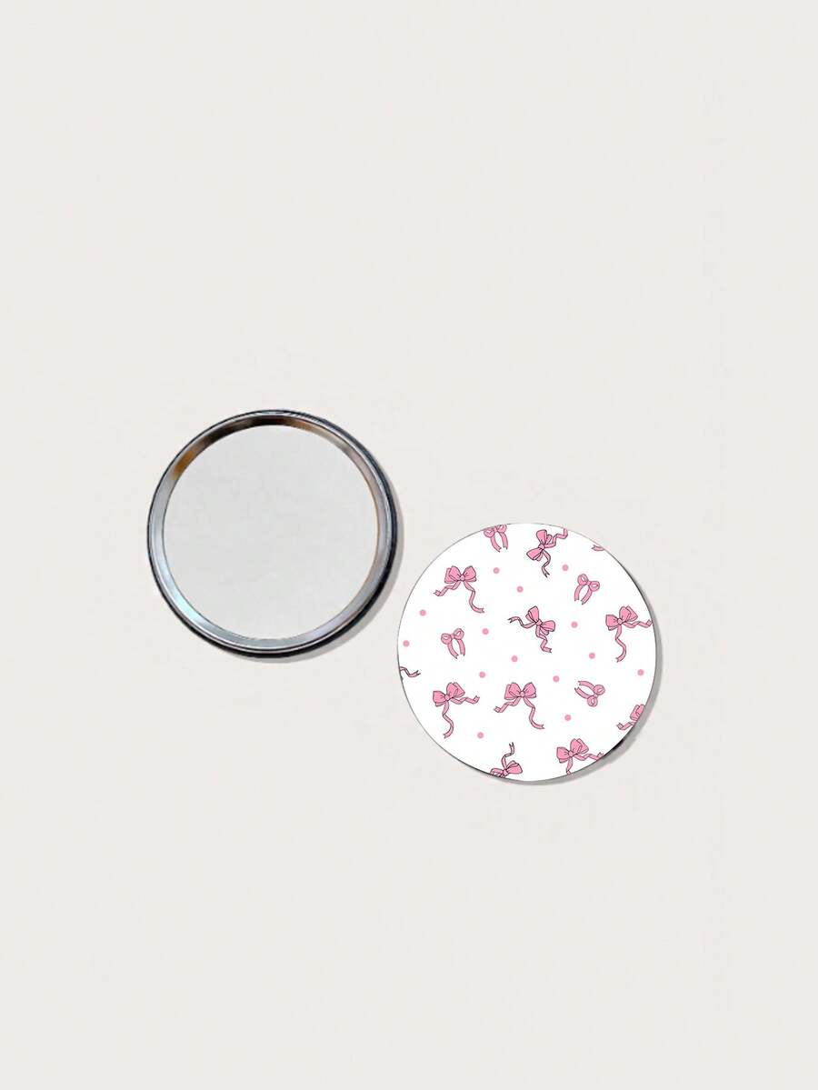 Kawaii White Base Pink Bow Round Compact Mirror, Portable Makeup Mirror