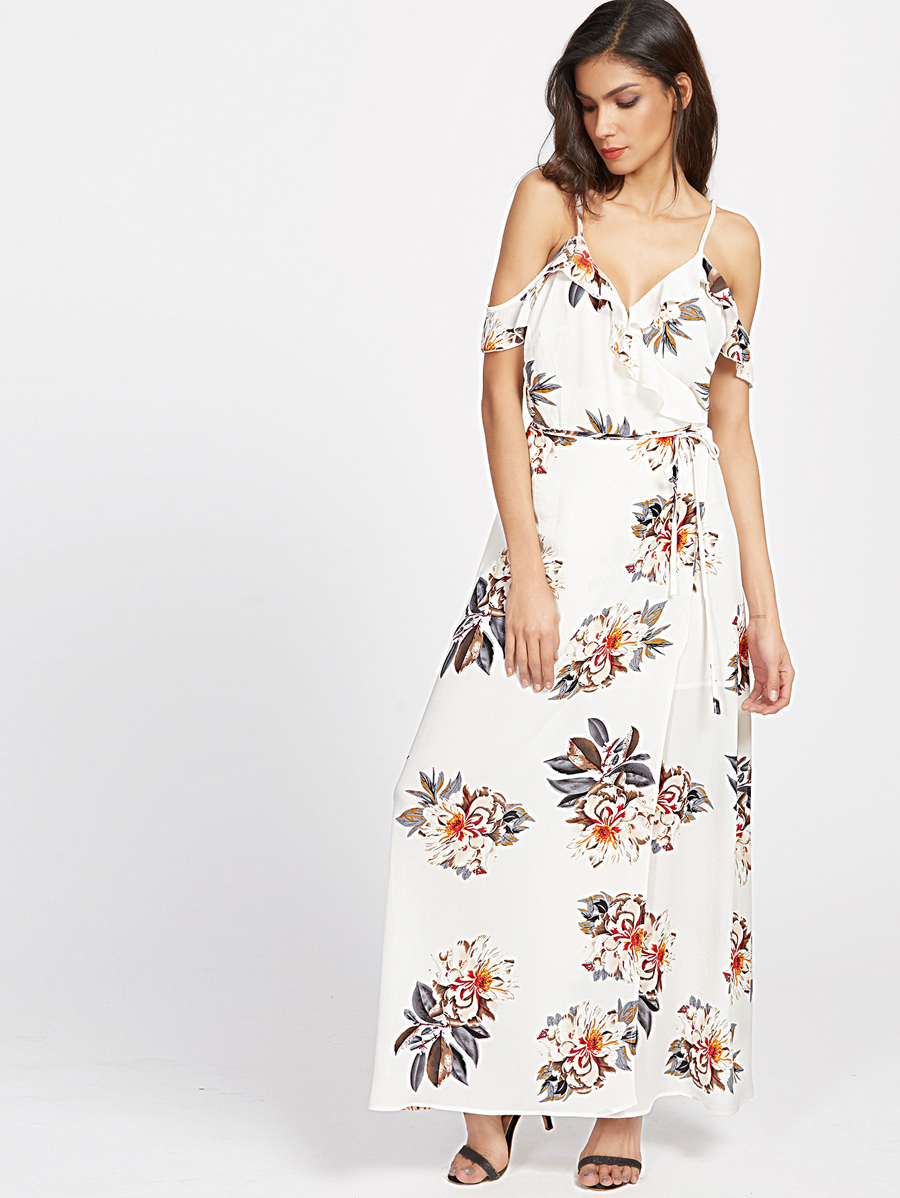 White Florals Cold Shoulder Ruffle Trim Wrap Dress
