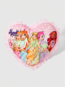 Winx Club X ROMWE 1pc Lace Edged Cushion Cover With Six Fairy Girl Graphic On Pink Background, Suitable For Living Room And Bedroom